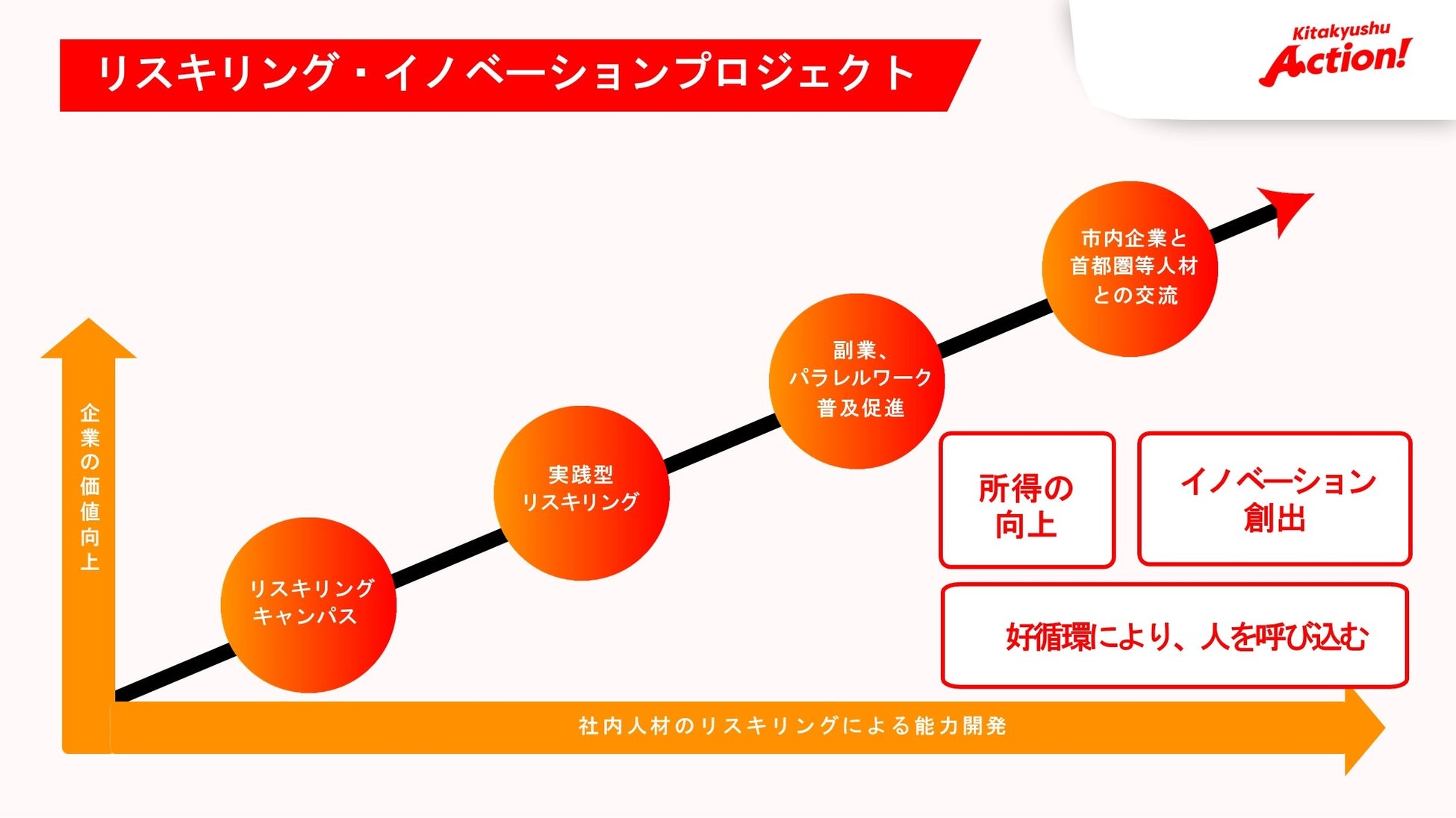 北九州市は、昨今、デジタル技術の発達や普及による産業構造の変化が進む中、基幹産業である製造業の伸び悩みや、第三次産業の成長停滞、産業の新陳代謝停滞、人口減少の中での投資停滞、若者の県外への流出等、さまざまな課題を抱えています。これらの課題を解決し、地域経済を成長軌道に乗せていくには、「市内企業が人を資本と捉えて、人材の育成の環境をつくりだし、企業の成長に繋げていくこと」と「リスキリングにより市内人材が新たなスキルや技術を習得すること」が重要と考えています。