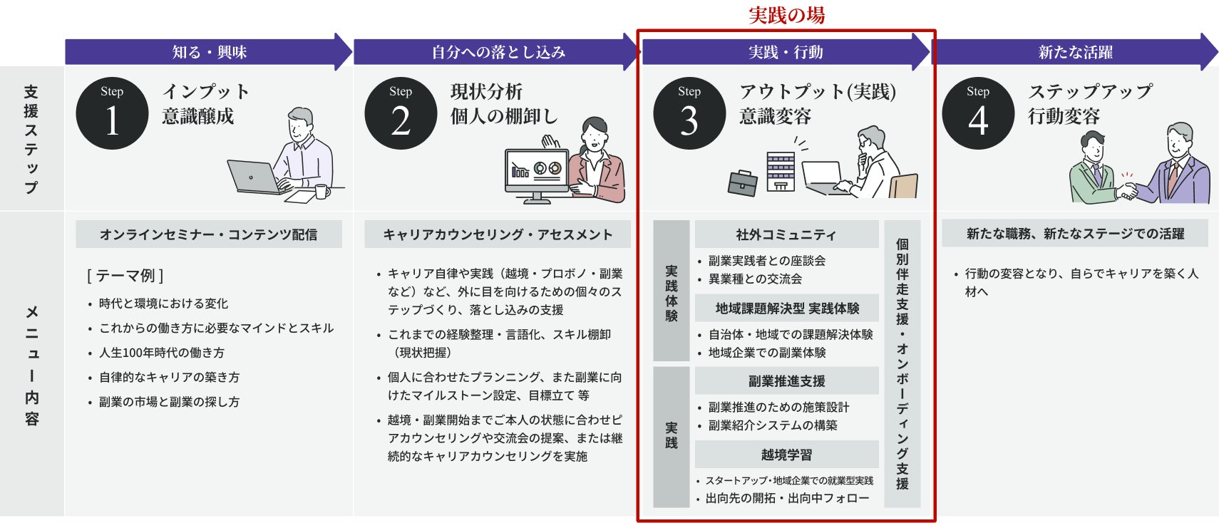 オンラインプログラムによるインプット、キャリアカウンセリングによる自己理解、そして実践によるアウトプットの場を提供しています。意識醸成から実践までのトータルでサポートもしくは、ニーズに応じたステップやメニューごとのサポートが可能です。