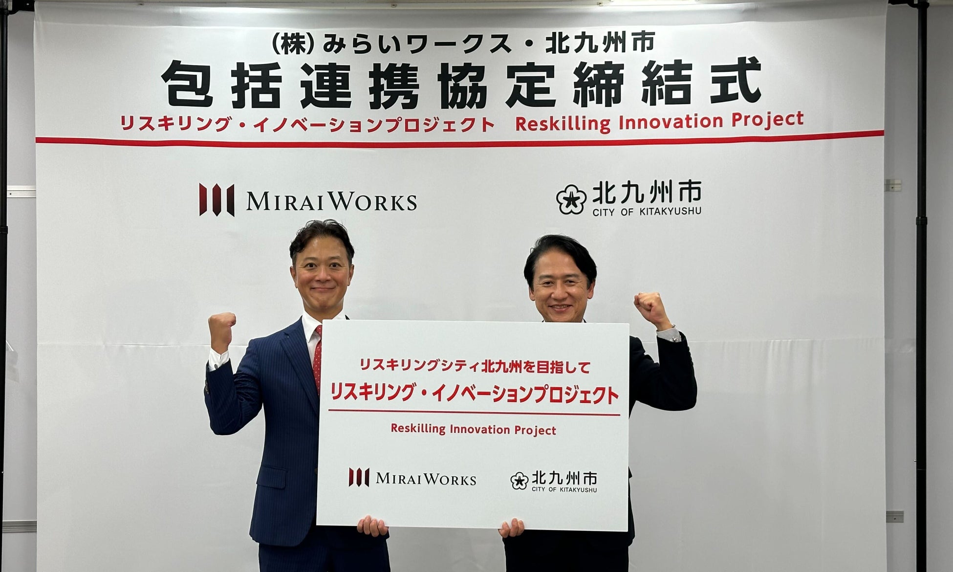 株式会社みらいワークス(本社:東京都港区、代表取締役社長 岡本 祥治、以下「当社」)は、福岡県北九州市(市長 武内 和久)とリスキリングに関する包括連携協定を2024年10月8日に締結し、リスキリング・イノベーションプロジェクトを開始することをお知らせします。当社は、今後、北九州市に拠点を設け、『リスキリングキャンパス』を開設し、北九州市内企業に対して、社内人材のリスキリングの重要性の啓発や、ビジネススキルなどの座学研修、座学で学んだ事をアウトプットする実践の場などを提供します。本取り組みを通じて、市内企業の従業員の所得向上や副業・パラレルワークの普及推進を図り、さらなる人材を呼び込む好循環を実現する「北九州モデル」の確立を目指します。