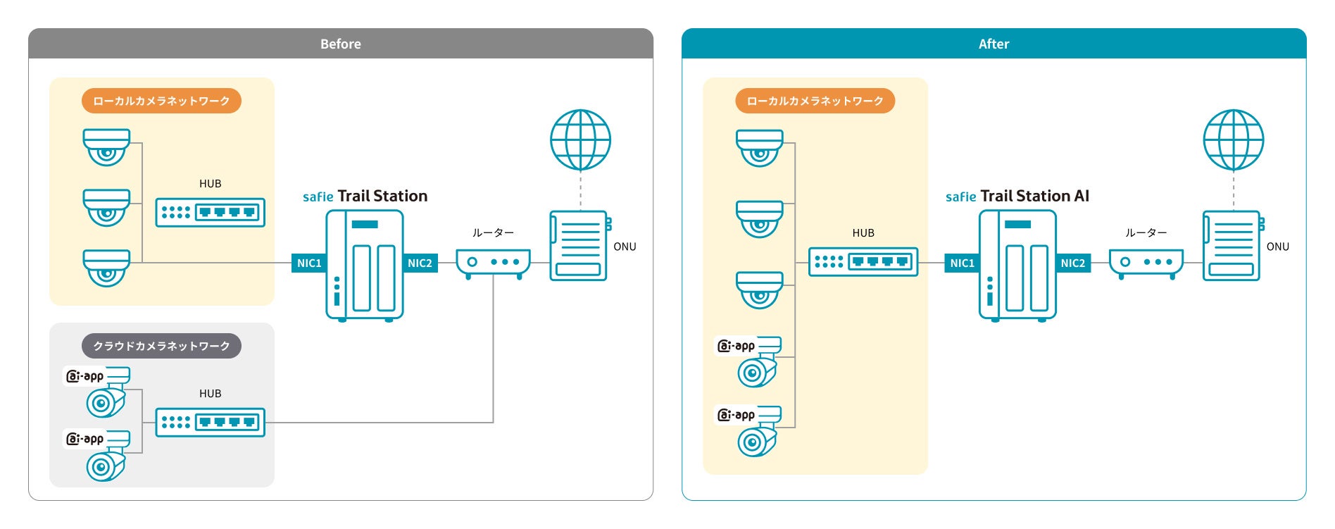 「Safie Trail Station AI」は、接続されたカメラ映像のAI処理を端末内(エッジ)で行う機能を備えています。これまでは、「AIアプリケーションを利用するカメラ(インターネット接続必須)」と「セキュアに録画するカメラ(ローカル運用)」を混在させる場合、設置企業のセキュリティ要件の関係上、ネットワークを物理的に分離する構成にして、2系統敷設することが一般的でした。