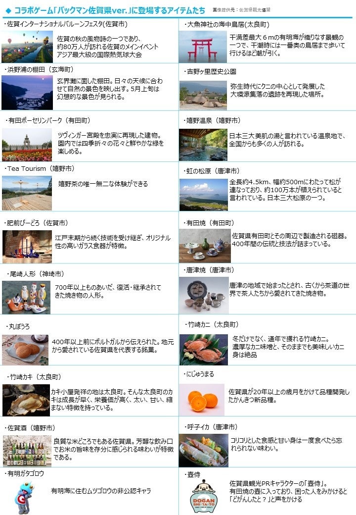 また、ステージごとに佐賀県の観光スポット・佐賀グルメ・伝統工芸品・ご当地キャラなど全20種がアイテムとなって登場。パックマンがアイテムをゲットすると、ステージクリア時に人気声優・古賀葵さんと西山宏太朗さんの掛け合いによる佐賀県アイテムの紹介を見ることができます。
