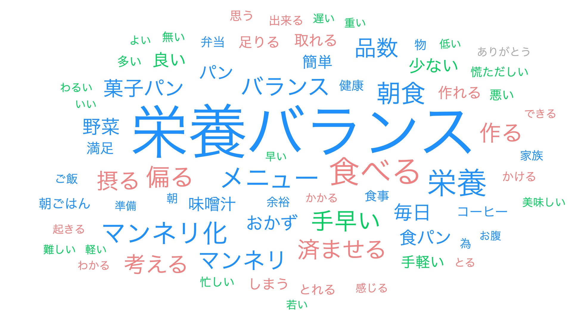朝食に点数をつけるとしたら100点満点中何点をつけるかという問いでは、平均53点という結果となりました。更にその点数をつけた理由を自由回答で募り、回答内に使われた単語の特徴を分析(※)したところ、「栄養バランス」のスコアが最も高く、次いで「マンネリ化」「マンネリ」といったワードが浮かび上がりました。