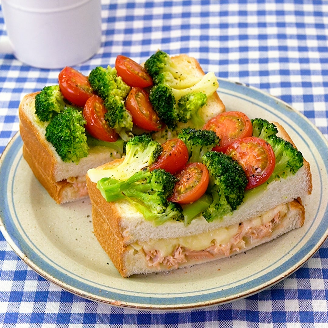 具材を重ねてトースターで焼くだけ!ツナメルトサンドに野菜をのせた、トーストサンドとオープンサンドが一緒になったいいとこ取りの一品です♪野菜を彩りよく並べることで見た目のインパクトも◎