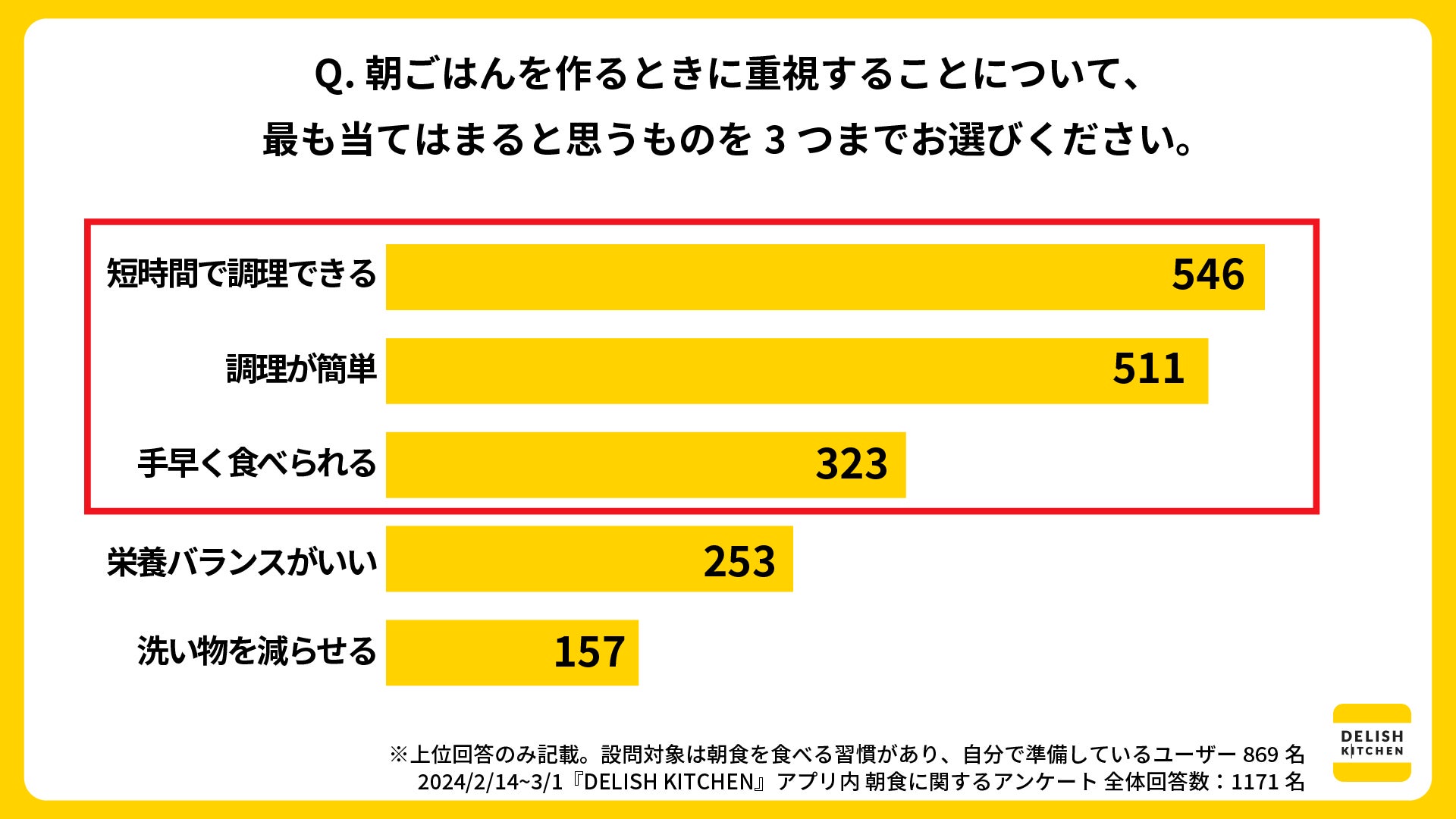 株式会社エブリー(本社:東京都港区、代表取締役:吉田 大成)が運営するレシピ動画メディア『DELISH KITCHEN』は、新生活シーズンに合わせ、アプリユーザー1171人を対象に朝食に関する調査を実施しました。その結果、朝食の自己評価は100点満点中平均53点と低く、多くのユーザーが「栄養バランス」や「メニューのマンネリ化」に課題を感じていることが分かりました。そこで、『DELISH KITCHEN』ではこの春から実践できる、10分以内にできて栄養もたっぷり摂れる朝食メソッド「3色朝ごはん」を開発しました。