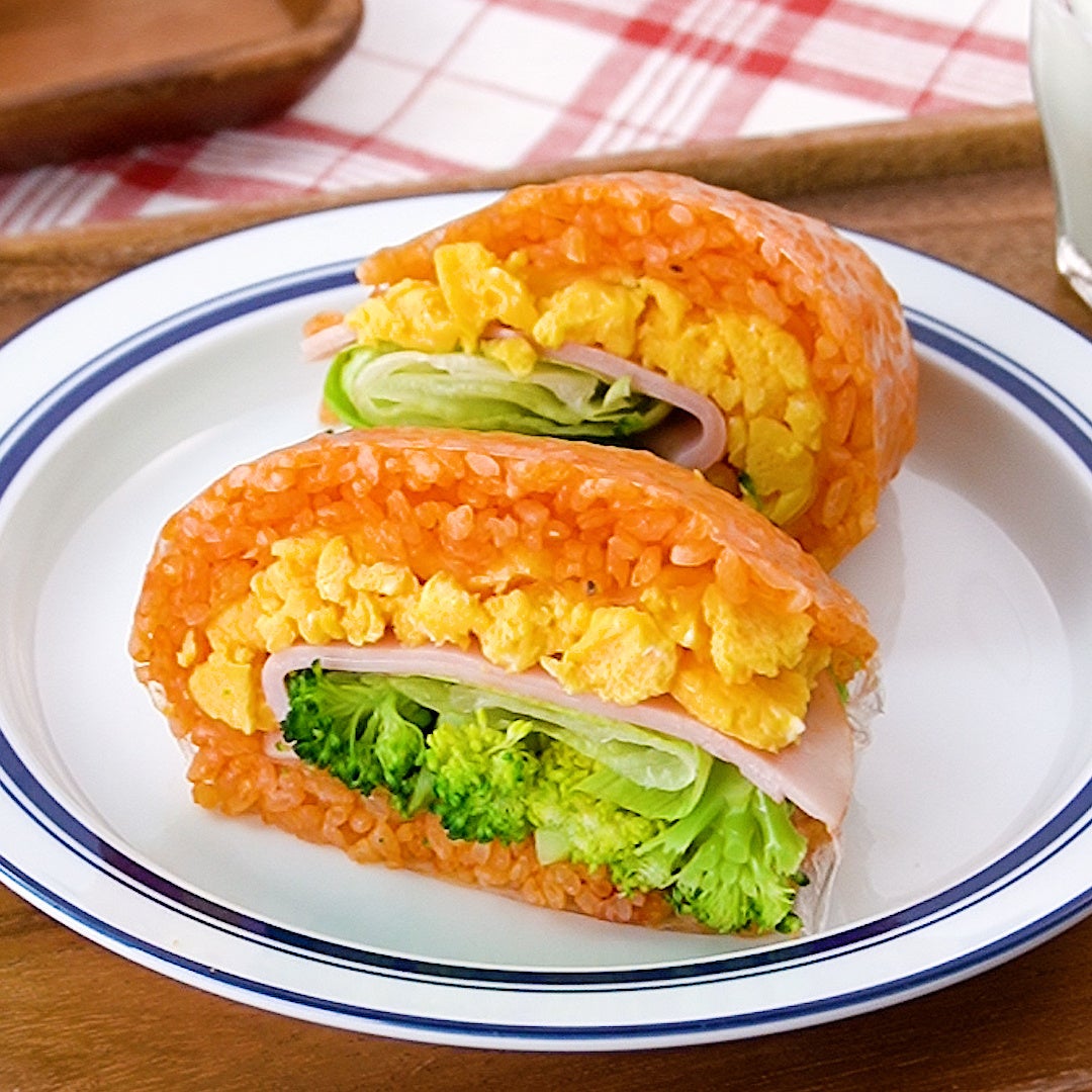 3色の具材をライスペーパーで巻くことで、片手で食べられるオムライスが完成!華やかな見た目も朝の気分を上げてくれます。