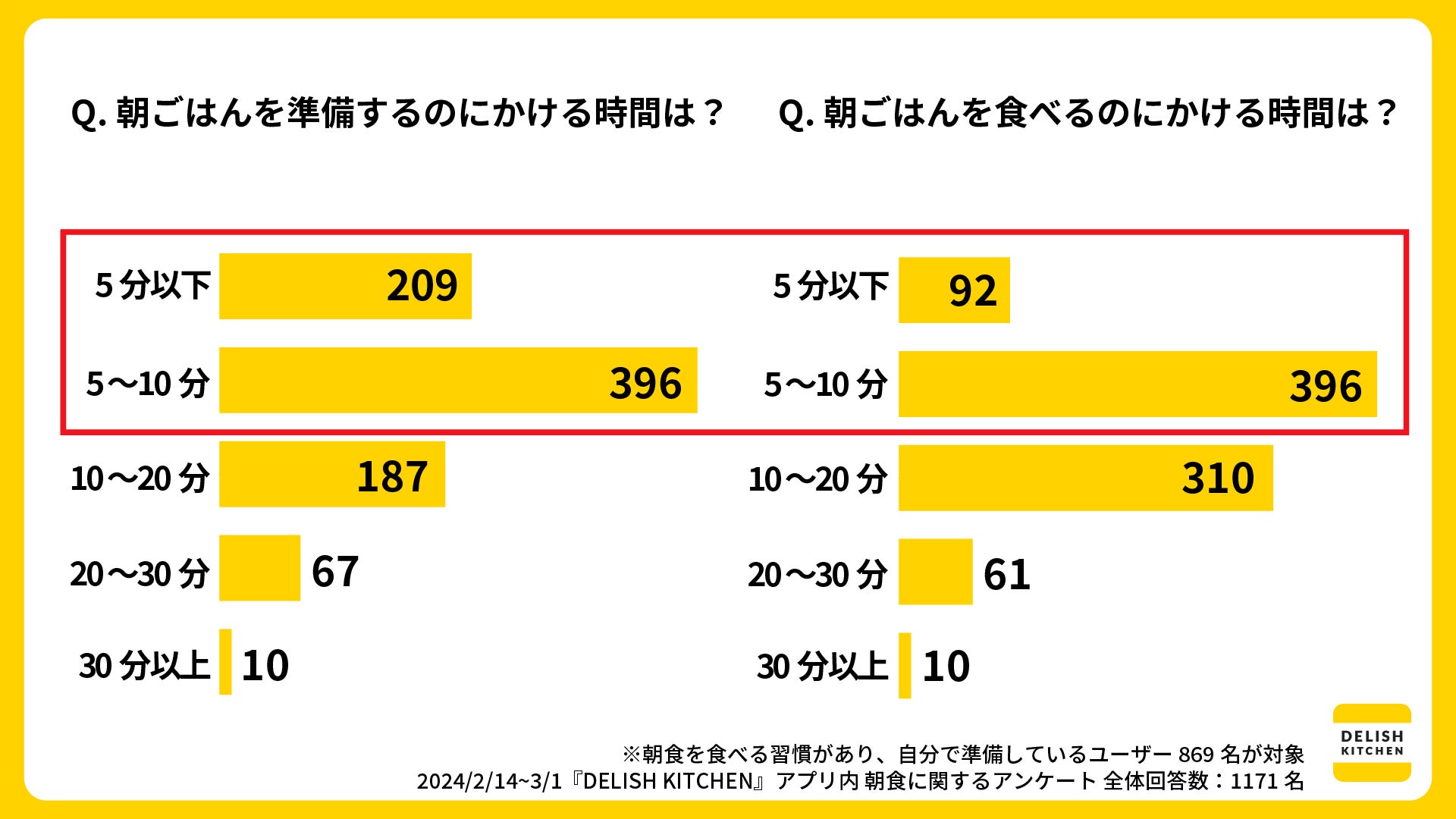 また、実際に朝ごはんを準備するのにかける時間、および食べるのにかける時間を聞いたところ、どちらも過半数が10分以内と回答しました。