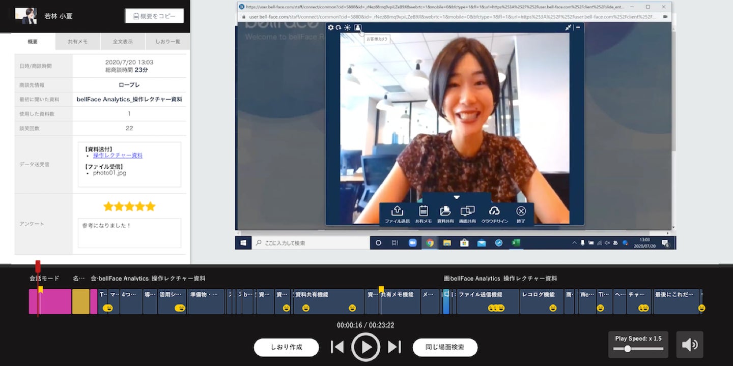 「bellFace」は、アプリインストールやURL発行などの事前準備が不要で、PCやスマートフォンを使って、簡単に資料や画面の共有ができるシステムです。商談内容は録画・録音・文字起こしすることができます。