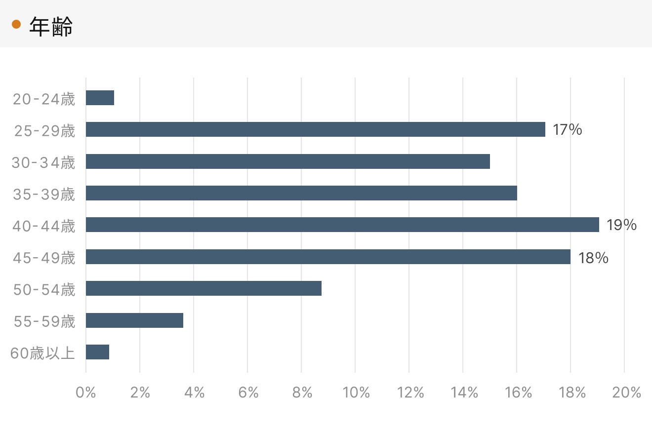 2024年4〜6月度における成約顧客の年齢のボリュームゾーンは、40〜44歳の19%でした。次に多い割合は45〜49歳の18%、25〜29歳の17%となっています。