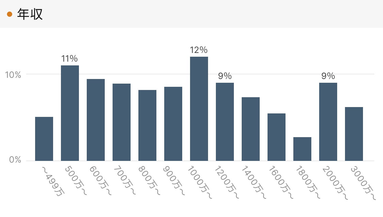 2024年4〜6月度における成約顧客の年収のボリュームゾーンは、1,000万〜1,200万円未満の12%でした。続いて500万円台が11%、1,200万〜1,400万円未満、2,000万円台が同率で9%となっています。