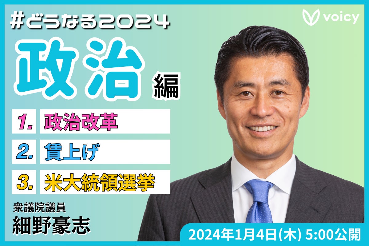 Voicyで放送中の専門パーソナリティが各領域で2024年に注目するキーワードを解説する音声を2024年1月4日(木)から順次公開します。今回取り上げるのは、政治・経済・社会・イノベーション・働き方・お金の6つの領域の注目キーワードです。衆議院議員の細野豪志さん、経済学者で慶應義塾大学名誉教授の竹中平蔵さんらが、2024年に注目するキーワードを解説します。
