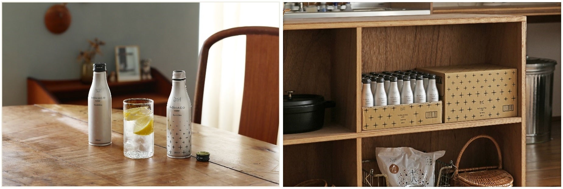 ボトルのパッケージデザインは、スウェーデンのデザインチーム「ストックホルム・デザイン・ラボ」とコラボレーションしました。ペットボトルタイプの「LOHACO Waterスパークリング 500ml」のパッケージデザインを継承し、シンプルで落ち着きのあるデザインに仕上げました。ボトル表面は塗装せず、リサイクル可能で美しい素材のアルミを際立たせました。ペットボトルタイプのオリジナル強炭酸水から進化を遂げた輝きを表し、白と黒のコントラストが際立つシャープで爽やかなパッケージデザインです。そのまま食卓に出しっぱなしでも周りのインテリアなどを邪魔せず、普段の暮らしになじむような工夫をしています。