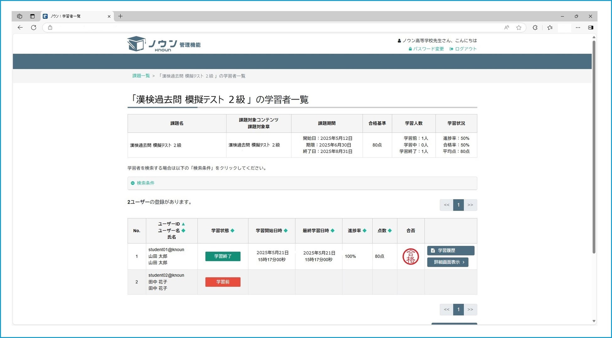 さらにノウンには先生がご利用いただける「学習管理機能」(別途有償)もご用意しています。この「学習管理機能」を利用することにより、児童・生徒に課題や宿題を出したり、学習状況をリアルタイムで確認したり、また解答内容や書き込み内容も確認することができます。