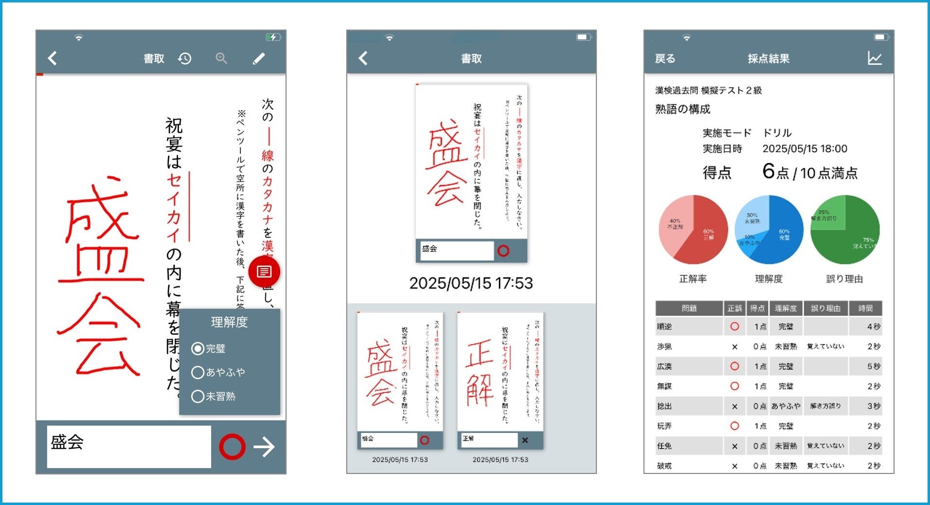 また、画面上に実際に漢字を書いて確かめることができる書き込み機能、間違えた問題や自信のない問題だけを再チャレンジする機能、過去の学習履歴と比較する機能、成績グラフ機能など、学習効果を高めるさまざまな機能が搭載されています。