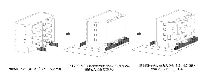 本計画地は、西側には山下公園がある開けた土地に位置しています。眺めの良い眺望や自然光、木々を揺らす風が通り抜ける豊かな環境である反面、外からの視線や真夏日の直射日光、直接的に入る雨風等の好まれない要素も含まれています。本計画では、それらの要素のコントロールをデザインコンセプトとし、豊かな環境を切り取る「額のある住まい」といたしました。