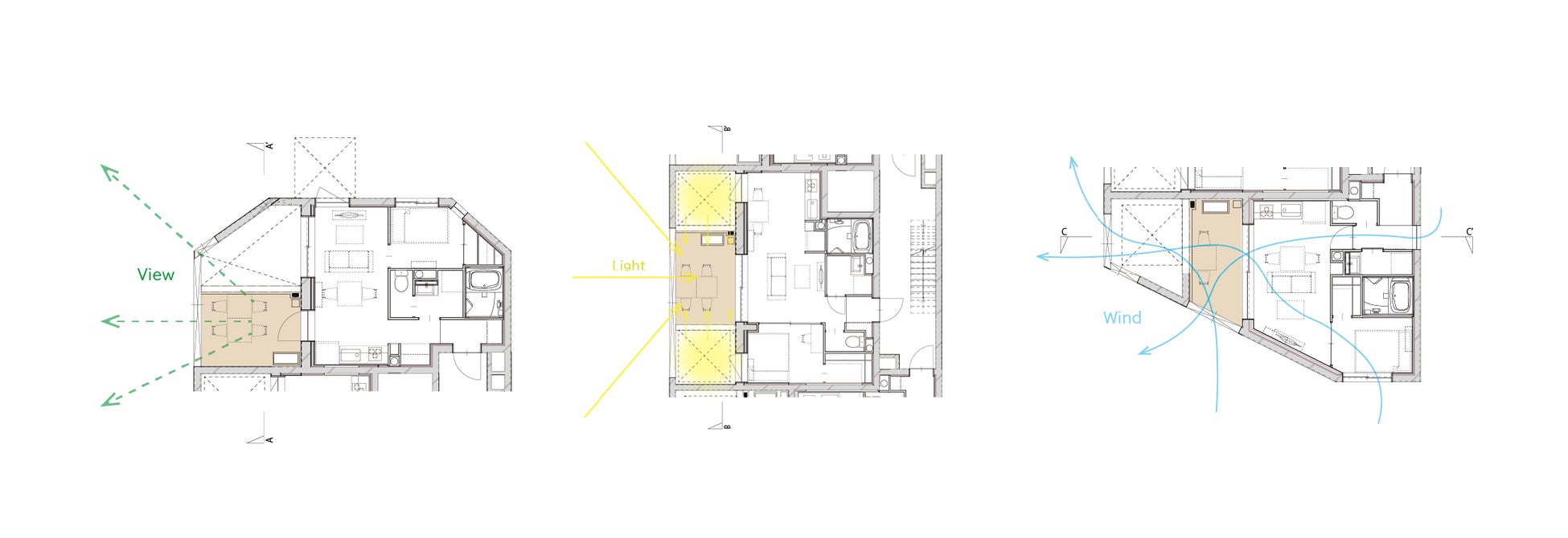 「額」を設けた壁が外と内を繋ぐ中間領域のような場所を生み出しており、この中間領域では、景色、光、風の要素をピックアップして、敷地の魅力を引き込みます。景色の要素は、フロアをまたぐ大きな開口を設け、視線が通り抜けるよう計画することで、視界が抜ける感覚を生み出します。光の要素は、吹抜けを設け、住戸内に自然光が降り注ぐよう工夫いたしました。風の要素は、バルコニーサッシを大きく設置し、部屋と屋外空間を繋げることで、風が通り抜けるような空間設計となっております。