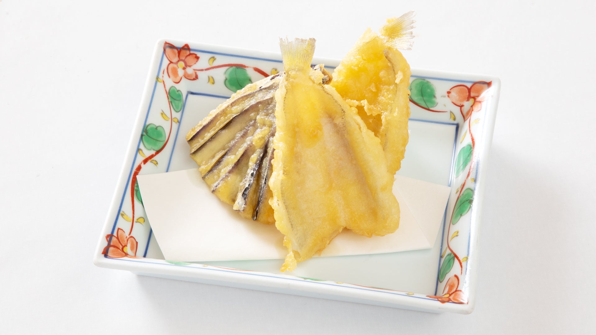淡泊で上品な味わいのある鱚をサクサクの衣で包み揚げた天婦羅です。お塩を添えて素材の旨味をお楽しみください。