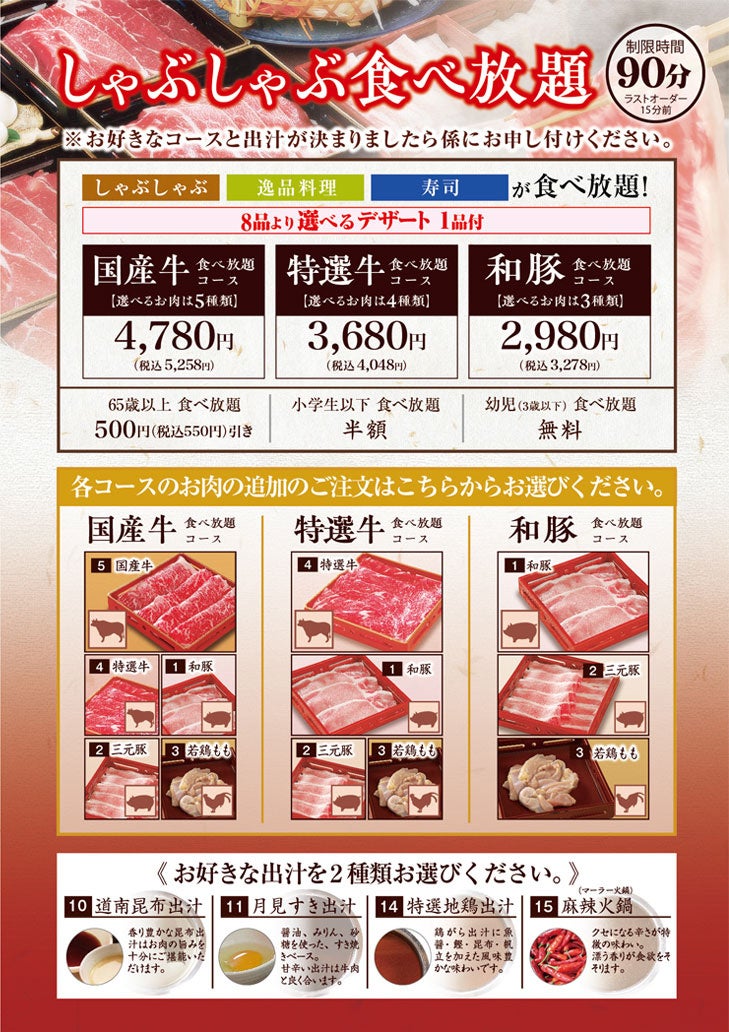 食べ放題コースではしゃぶしゃぶ、寿司、串揚げ、逸品料理など様々な種類のお料理を提供。また、