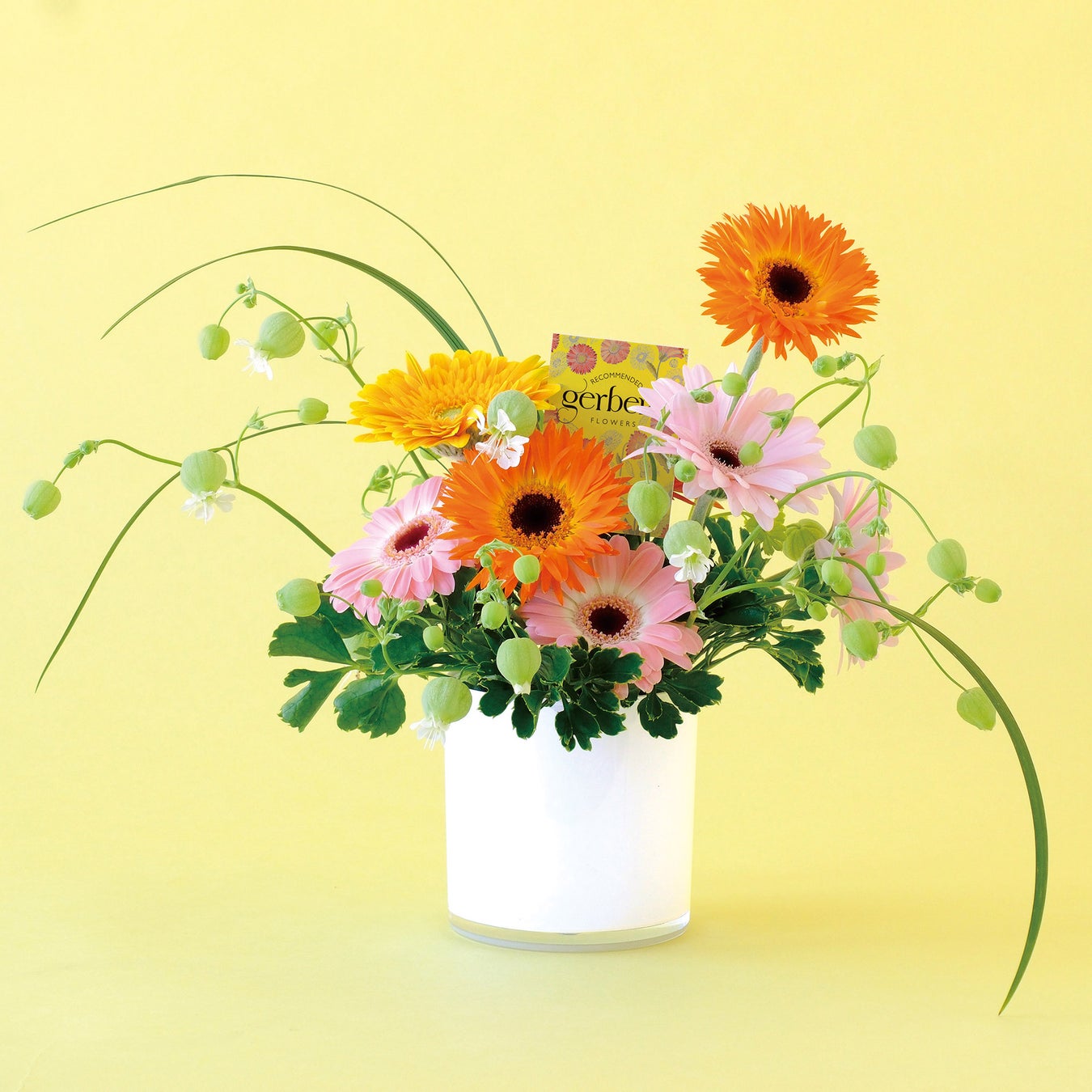 ショップおすすめのガーベラをナチュラルなアレンジメントに仕上げました。器付きでそのまま飾って楽しめます。