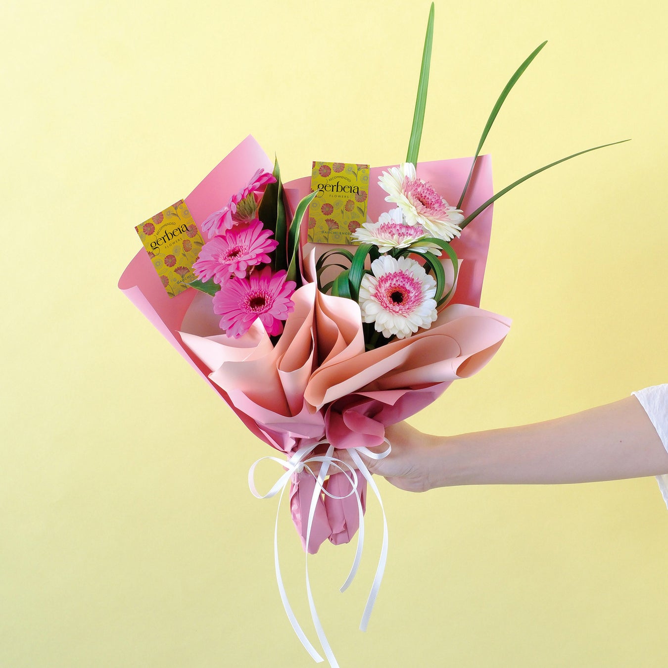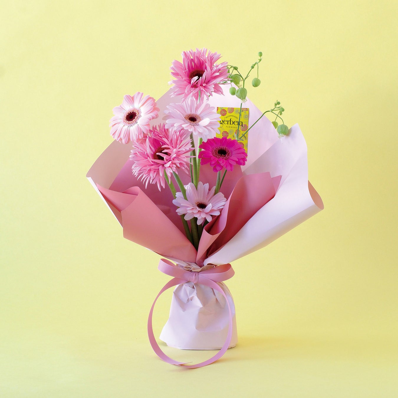 ショップおすすめのガーベラをシンプルなブーケに仕上げました。コンパクトなサイズでちょっとしたギフトやご自宅用にもおすすめです。