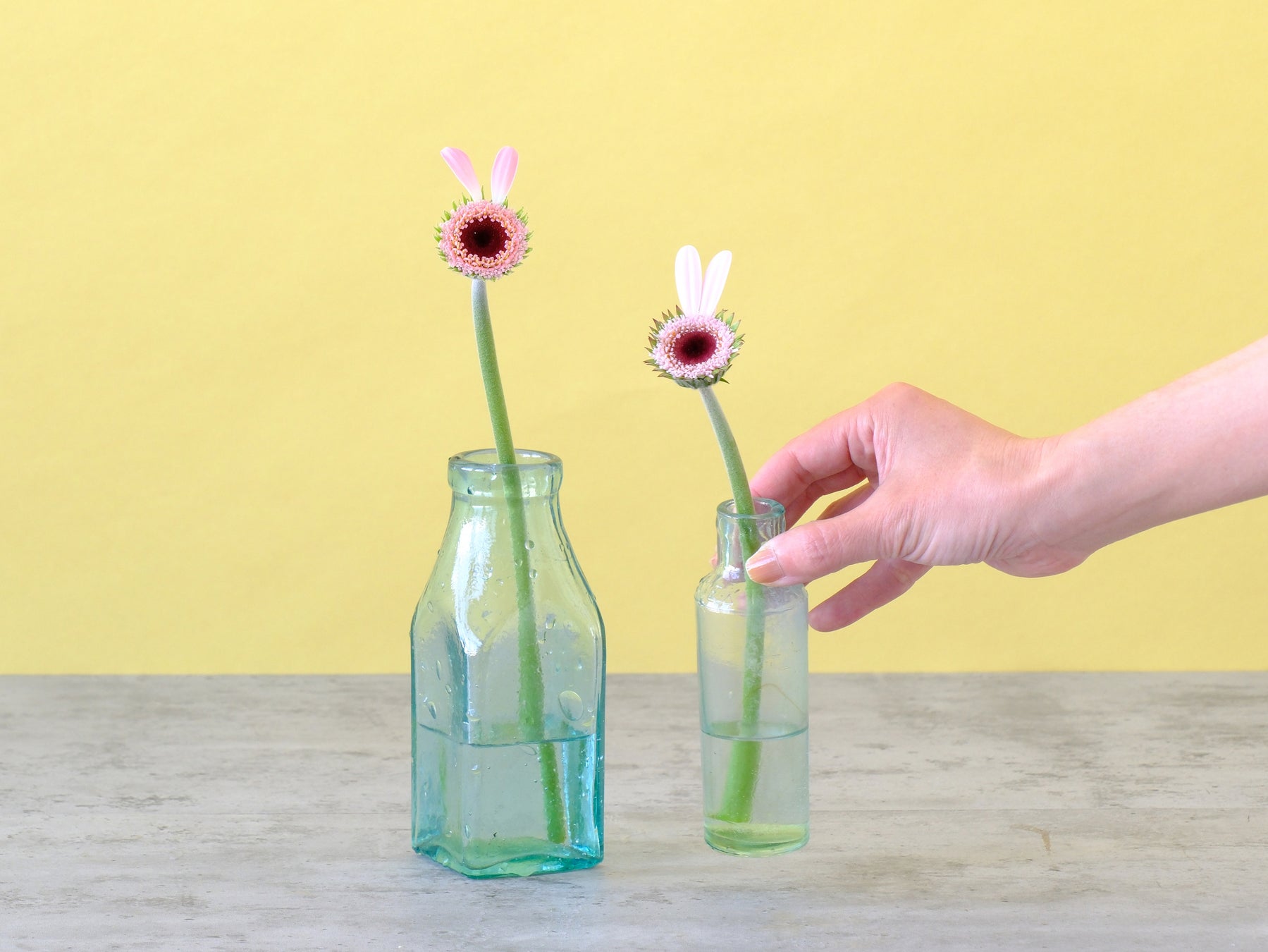 ガーベラの茎は空洞で、周りに細かな繊毛が生えています。この茎は水が付くと傷みやすくなるので、浅めの水にいけます。お手入れの時は水に浸かった部分の茎を切りましょう。また、長さは基本的に短い方が花持ちも良くなります。くたびれてきたら思い切って茎の長さを短くしてみましょう。