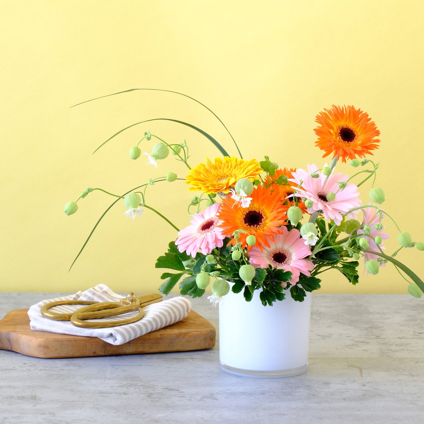 今回は、新生活のスタートにそっと寄り添ってくれるような、ポップでキュートなアイテムを中心にご用意しました。春のギフトとしてはもちろん、新しい暮らしの中で前向きな気持ちを明るく彩ってくれる花として、ガーベラのある時間を楽しんでいただけたら嬉しいです。