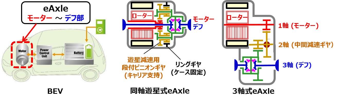 ① BEVにおけるeAxle搭載位置と同軸遊星式eAxle、3軸式eAxleの構造