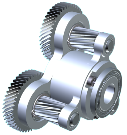 なかでもモーター軸に連結するサンギヤ、eAxleケースに固定するリングギヤ、それらとかみあいトルク分岐・合流させる複数の段付ピニオンギヤをもつ遊星減速式は、更なる減速機小型化と、ピニオンギヤを含むキャリアとデフの一体化が可能ですが、一般的なベベルギヤ式デフではキャリア機能との干渉を避けるため並列配置となり、幅寸法の抑制が課題でした。