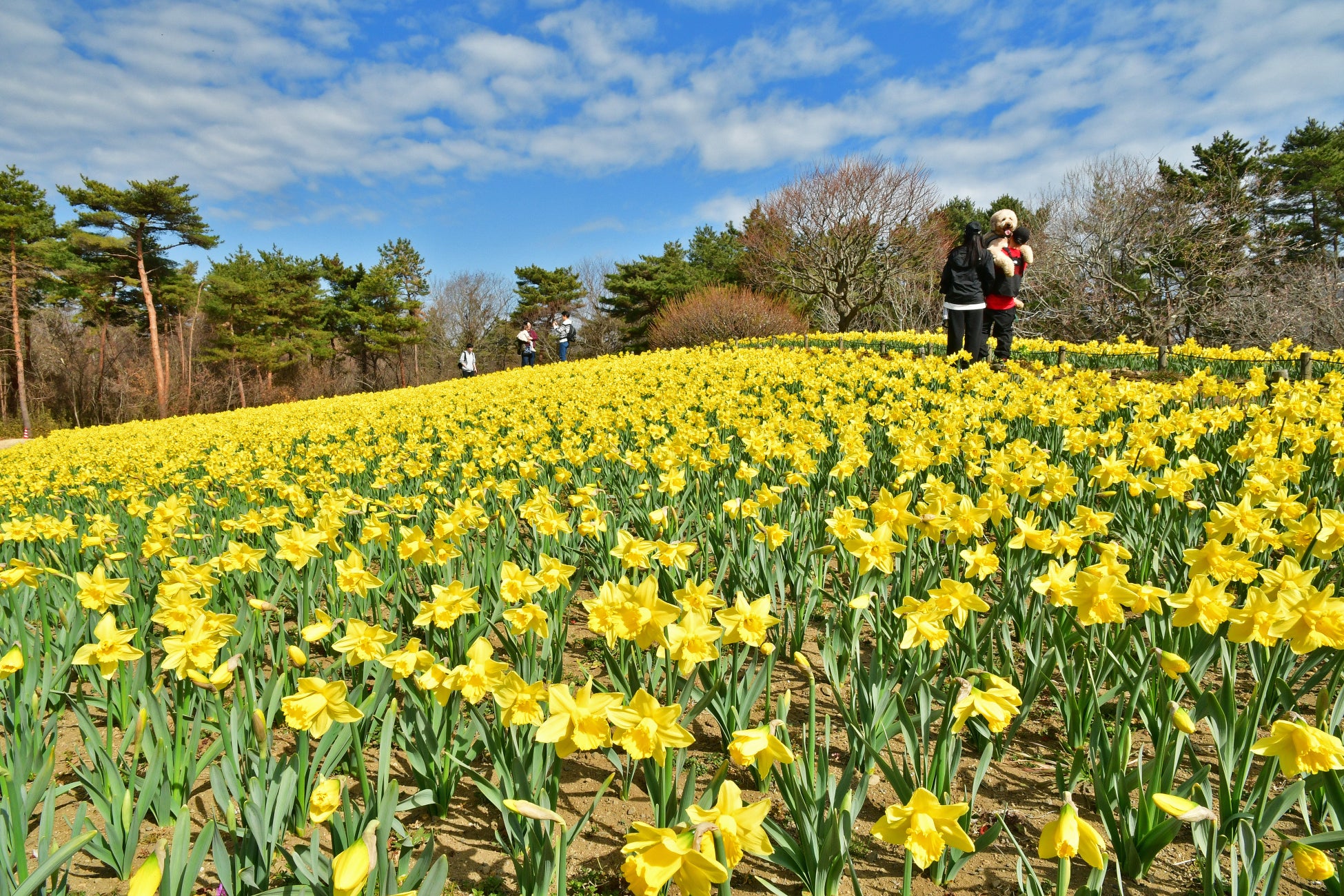 早咲きスイセンに続き3月下旬頃から、約1haの「スイセンガーデン」で、約180品種・約100万本のスイセンが見頃を迎える予定です。当公園のスイセンガーデンの魅力は、松林の中で咲く独特の景観にあります。柔らかな木漏れ日と白・黄色のスイセンが織りなす、幻想的な風景をご覧いただけます。