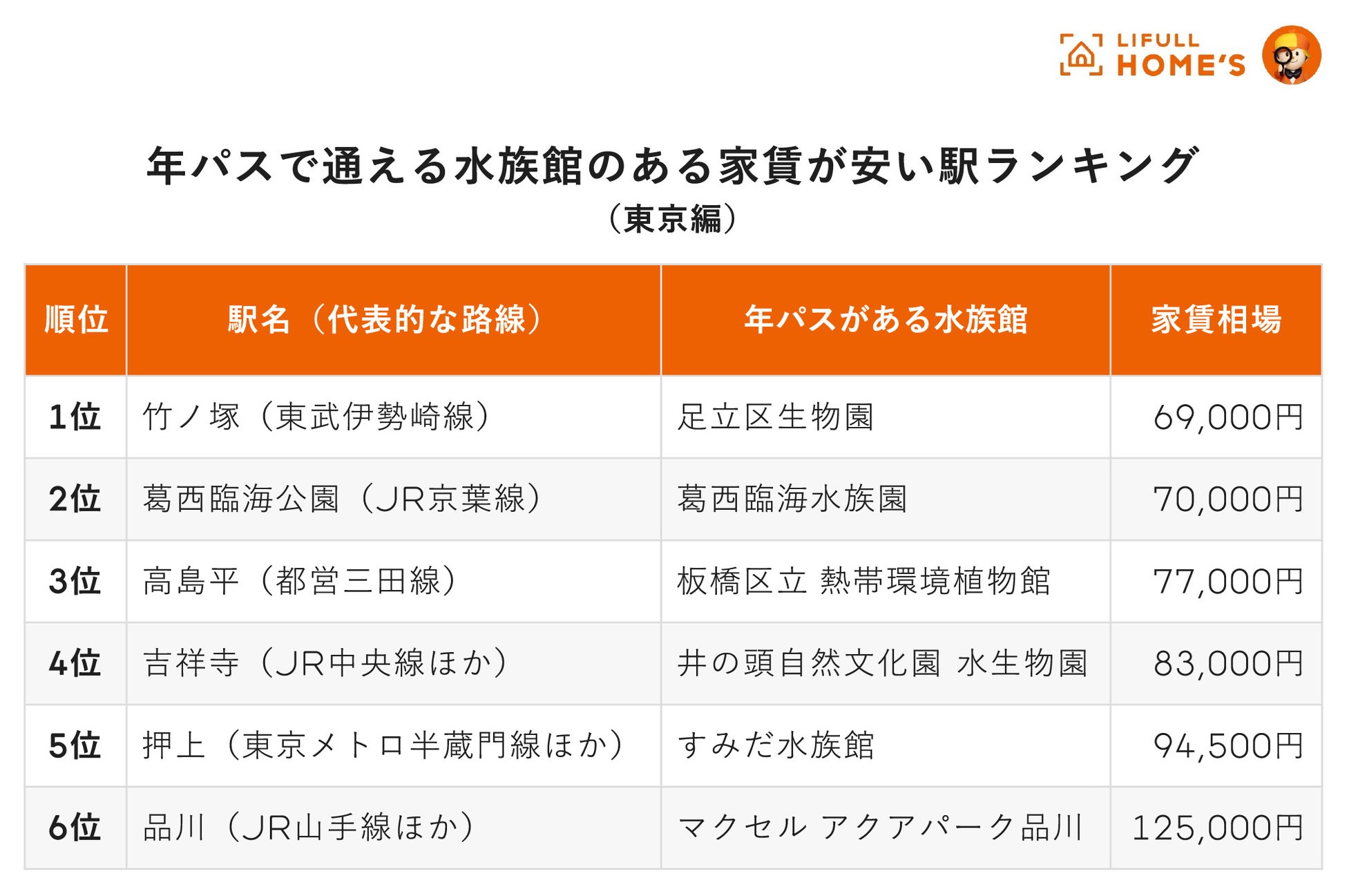 LIFULL HOME'S「年パスで通える水族館のある家賃が安い駅ランキング(東京編)」