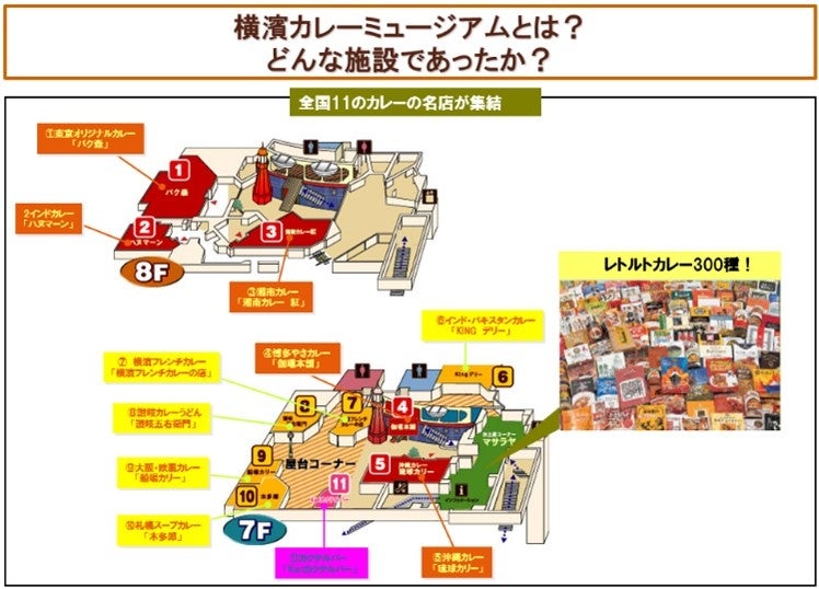 2001年の開館から2007年の閉館まで、全国から横濱カレーミュージアムに出店したカレーの名店は、延べ100店。提供されるカレーの種類が多彩なうえ、レストラン型の店舗もあれば、店舗が軒を並べるフードコート形式もあり、来館者を飽きさせない仕掛けになっていました。