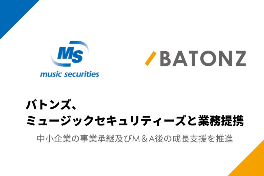 M&Aで中小事業者の存続と発展を支援してきたバトンズと、事業投資型クラウドファンディングプラットフォーム「セキュリテ」を運営するミュージックセキュリティーズは、中小企業の事業承継及びM&A後の成長支援を推進することを目的としてパートナー契約を締結しました。この業務提携を通して、両者は相互に協力しながら中小企業・小規模事業者を対象とするM&Aを推進し、事業投資型クラウドファンディングを活用して、M&A後の中小企業の成長を支援していくことで、日本経済の持続可能な発展に資することを目指します。