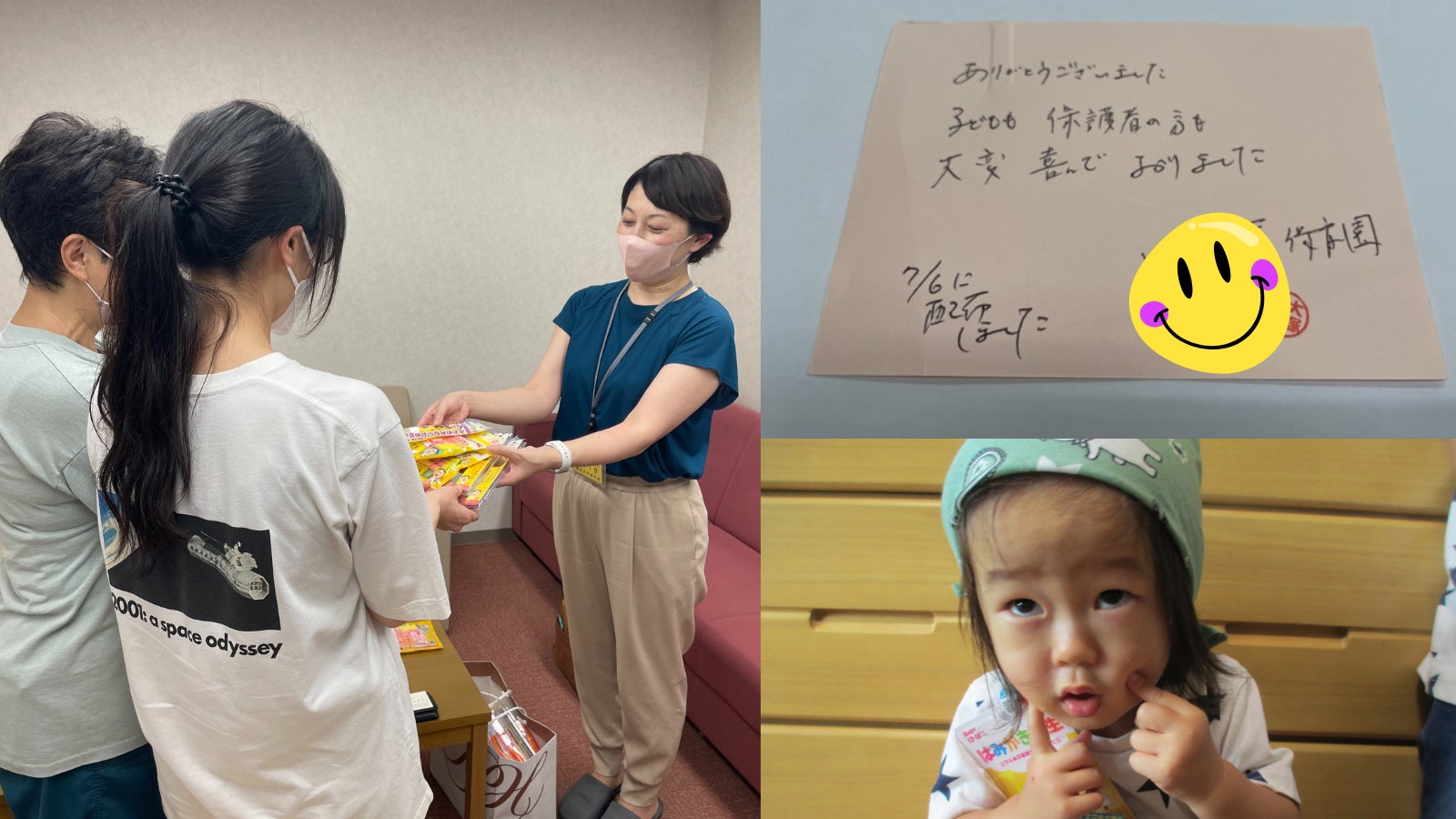 はみがき先生の商品考案を頂いている鶴見大学歯学部小児歯科学教授 朝田芳信氏より、商習慣的に廃棄される商品について「寄付を行ってみてはどうか」と、歯科検診を行っている母子生活支援施設をご紹介頂き寄付を実施。他にも児童養護施設や保育園、SOMPOケア株式会社(本社:東京都品川区、代表取締役社長 COO:鷲見 隆充)が運営するこども食堂や、学童保育を行う株式会社こどもCandy(本社:兵庫県神戸市、代表取締役社長:手塚 麻里)にも寄付を行いました。どの施設でも非常に喜んでいただき、お礼のメッセージやお写真を頂きました。