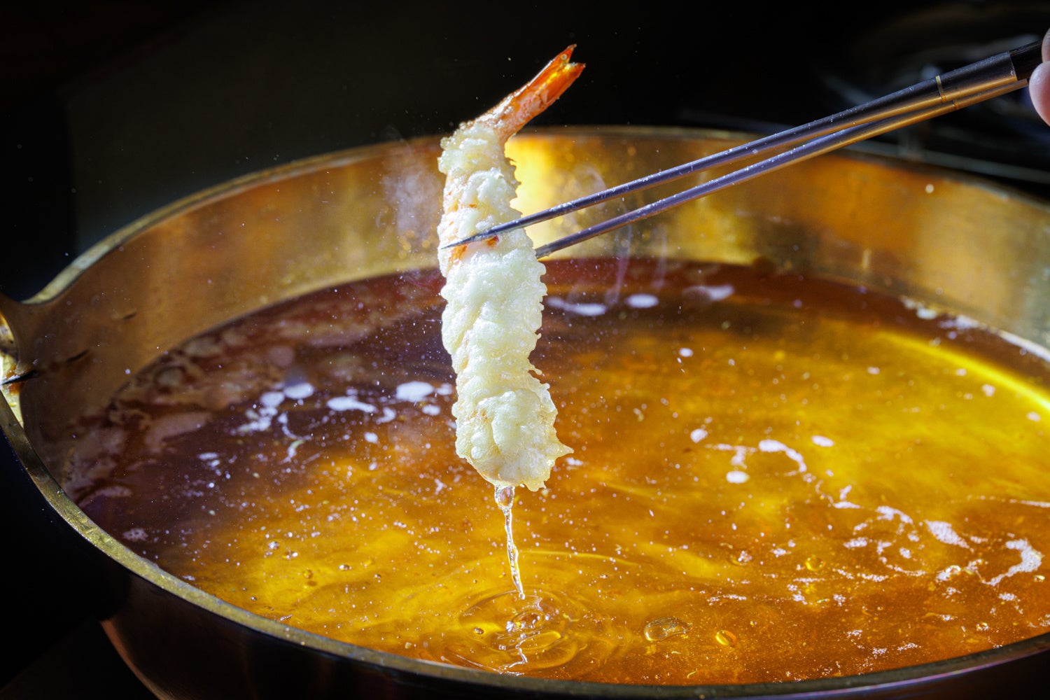 料理に使用する食材・調味料は料理長自ら生産者の元へ行き実際に吟味したものを使用しています。使用する油は最高級の「太白ごま油を100%」使用しており、ごま油特有の焙煎香が抑えられ、油切れも良い軽やかな天ぷらに仕上がっており、食材の旨味をダイレクトに感じて頂けます。ご提供する食材には料理長の遊び心を取り入れ、「みたらし団子」「毛蟹のコロッケ」などジャンルにとらわれない食材と調理法でオリジナルの天ぷら会席を提供しております。