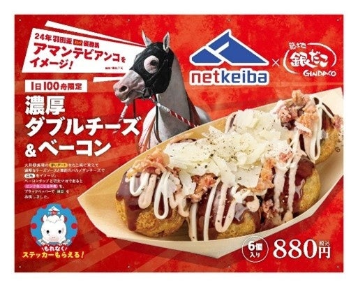 大井競馬場内「築地銀だこ」にて、netkeiba とのコラボ企画を第14回開催も実施。期間中は、2024 年羽田盃優勝馬「アマンテビアンコ」をイメージしたコラボメニューを販売するほか、コラボメニューをご購入いただいたお客様には「アマンテビアンコ」オリジナルステッカーをプレゼント!この機会にぜひ、大井競馬場内「築地銀だこ」へお越しください。