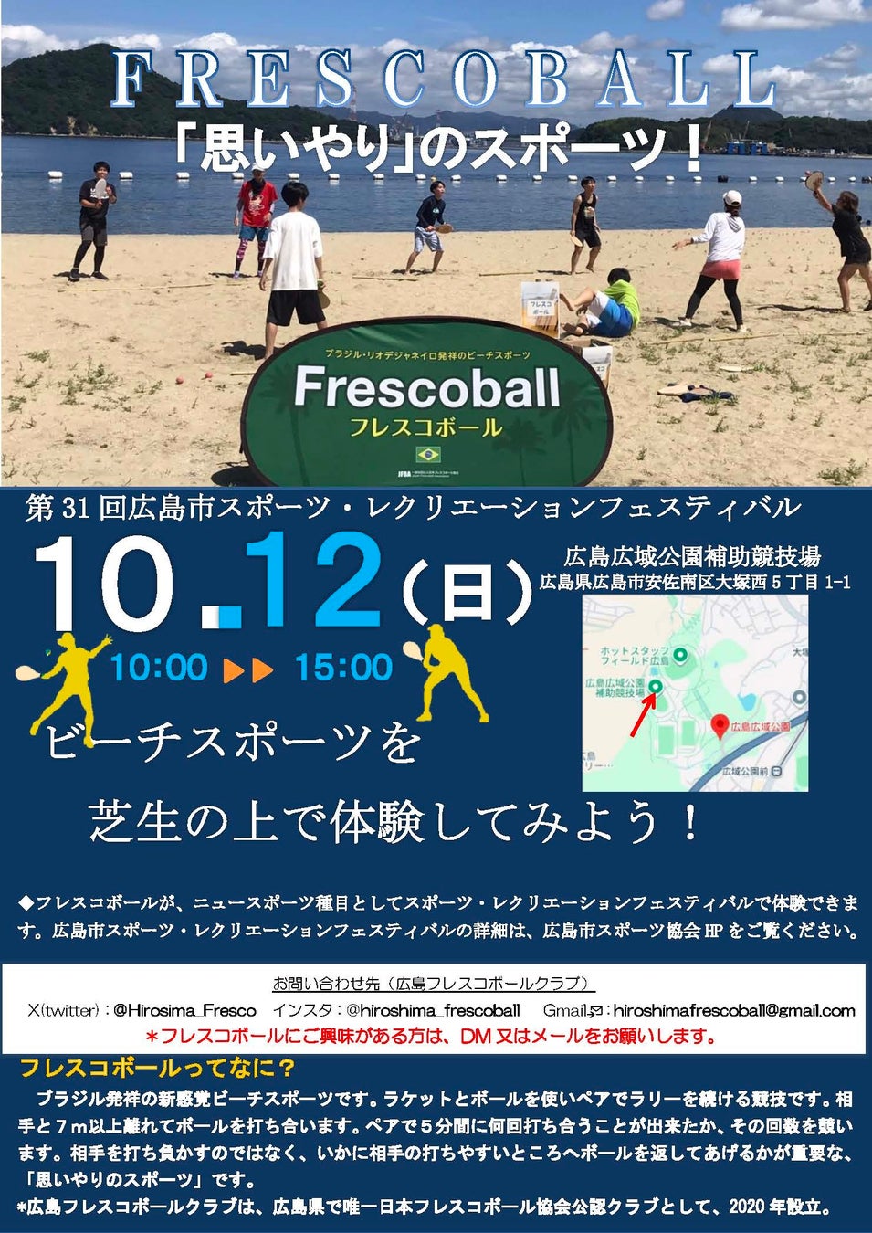 また10月12日には、『第31回広島市スポーツ・レクリエーションフェスティバル』で無料体験会を実施することも決定。会場は、広島広域公園補助競技場(広島市安佐南区大塚西5丁目1−1)。フレスコボールは、リオデジャネイロ・コパカバーナ生まれの「ビーチスポーツ」ですが、場所を問わず楽しめるのも魅力。今回は、芝生の上でラリーをすることに。ぜひお気軽に足をお運びください。