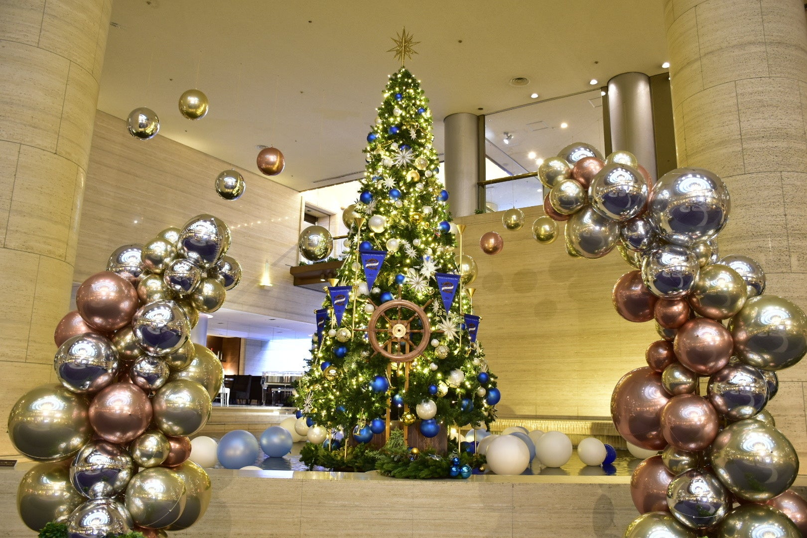 ホテル全体を豪華客船に見立て、天井高17mのメインロビーに高さ約5mのクリスマスツリーを設置します。館内各所、ホテルにご来館いただいたお客さまへホリデーシーズンを感じられる、美しく幻想的な世界へと導きます。