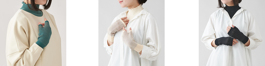 薄手のニットで室内外で使いやすい手首ウォ―マー。表と裏で糸の色を変えるプレーティング編みを用いています。さらにリブ編みにすることで、生地を広げると2色になり、立体感のあるデザインに。同じ色でそろえた「付け襟リブハイネック」とセットでお使いいただけます。