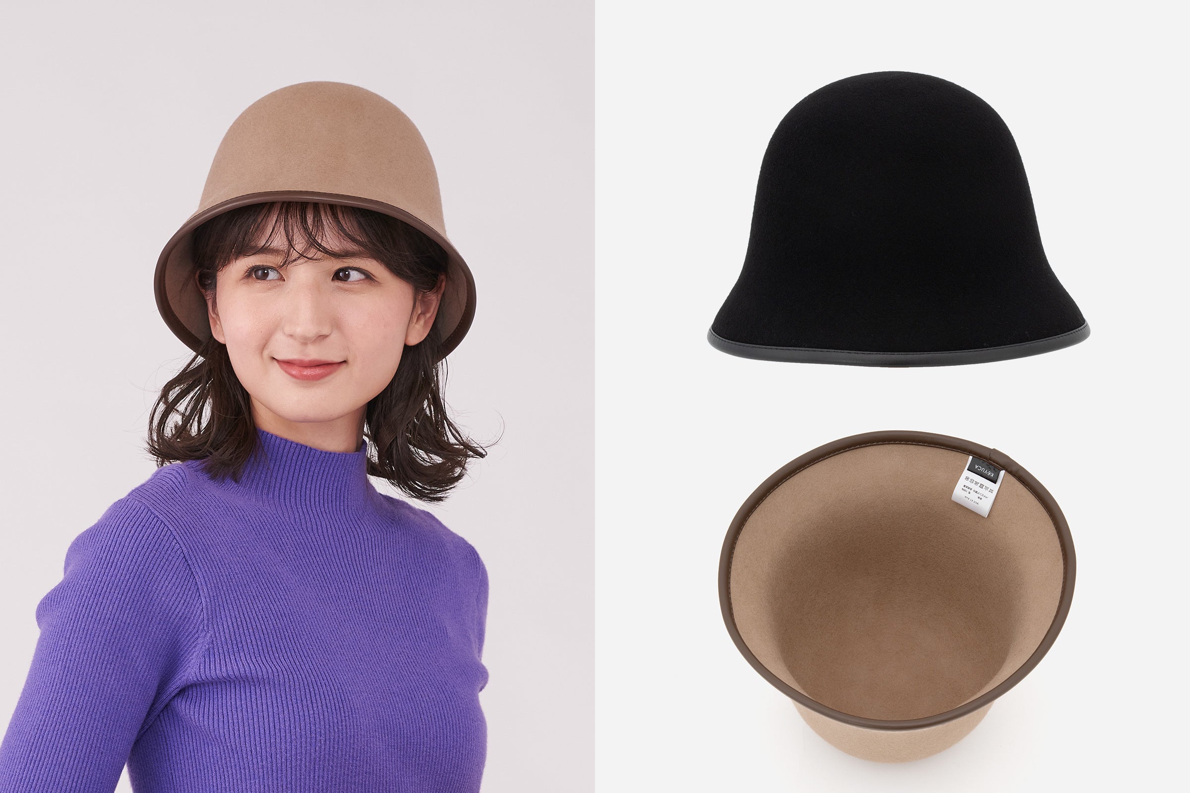 フェルト生地に、合皮でパイピングしたきれいめで高級感のあるデザインが特徴。つばが広がりすぎないデザインで、顔周りをすっきり見せてくれます。