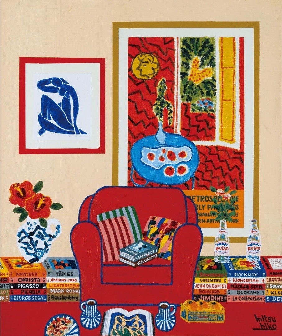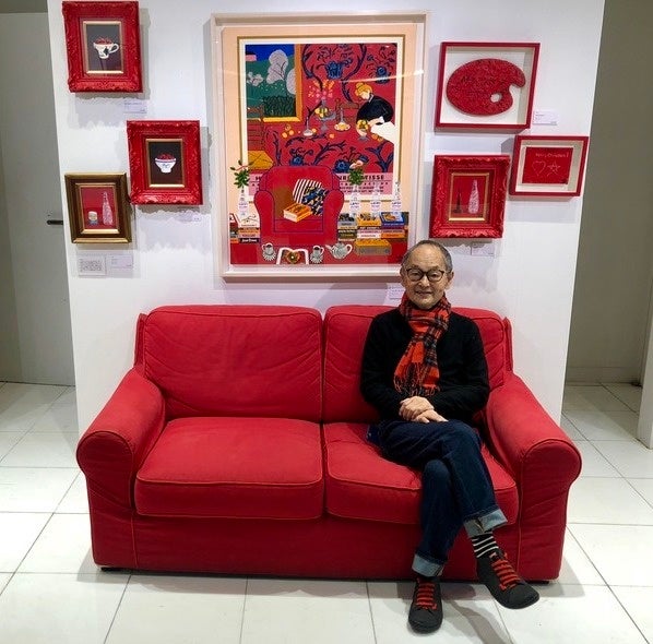 笹尾光彦(ささお みつひこ)さんは、ゆたかな色彩の室内画で知られるアーティストです。画家になったのは56歳のときという異色の経歴をお持ちでもあり、デビューから毎年、「Bunkamura Gallery」で秋に個展を開いています。弊社の代表、糸井重里はその展覧会をはじめて訪れたときの印象を、「手入れのいい花屋の店頭みたいにも思えるはなやかな会場」と言い表しました。笹尾さんとほぼ日は、「ほぼ日手帳」のカバーや「ホワイトボードカレンダー」の月の数字、「ほぼ日の水沢ダウン」の裏地など、幅広い商品のデザインや展示イベントでご一緒してきました。本展の会場である「ほぼ日曜日」のロゴを手がけたのも笹尾さんです。