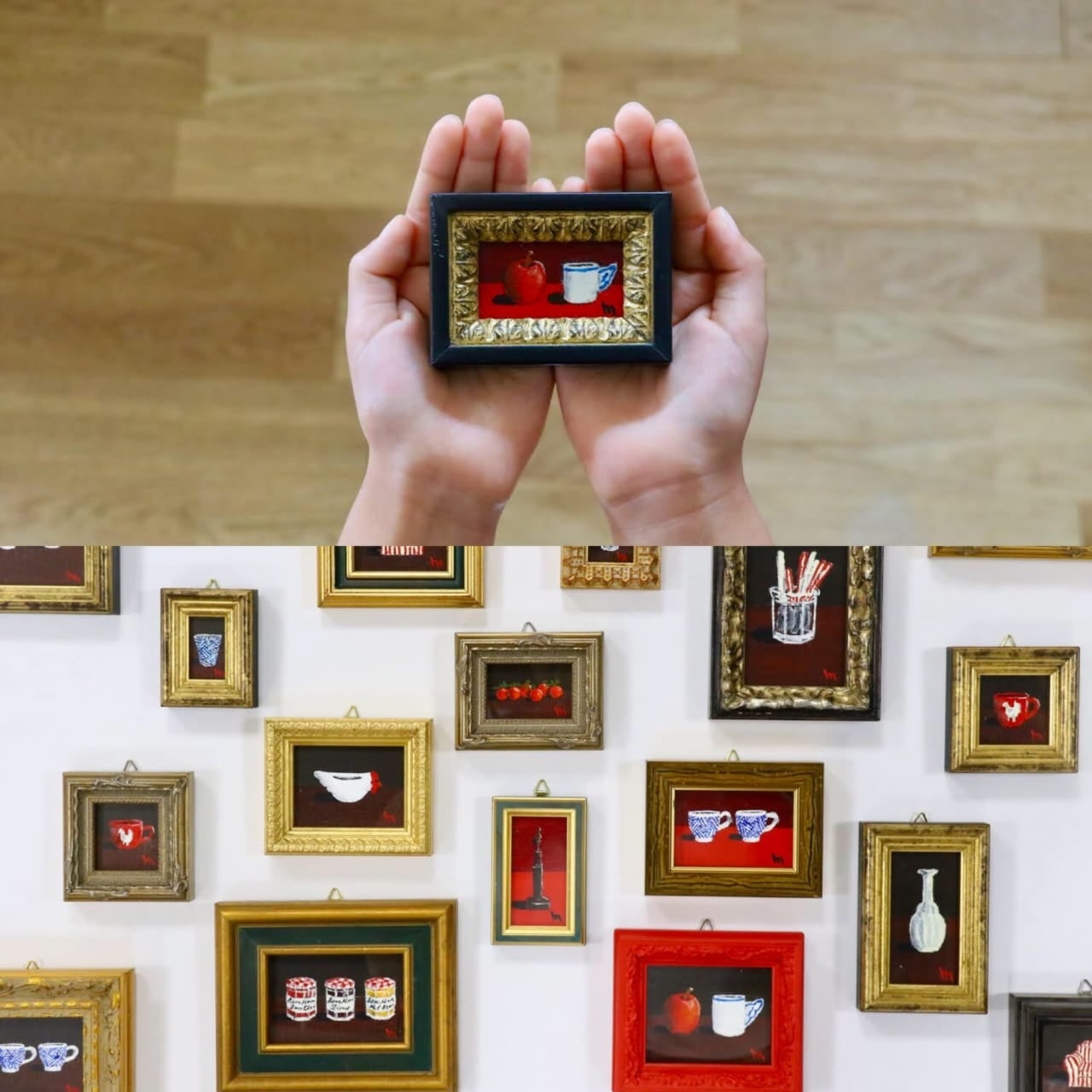『Mini Frame』:手のひらに乗るほどのサイズの油絵です。ひとつ「1万円(税別)」でその場で持ち帰れるので前期と後期にわけて計100点ほどを販売します。