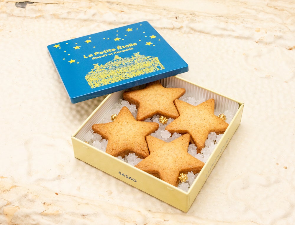 お土産におすすめなビスケット缶「La Petite Étoile」には、12枚の星のビスケットと金と白の金平糖が入っています。パッケージの絵も笹尾さんです。