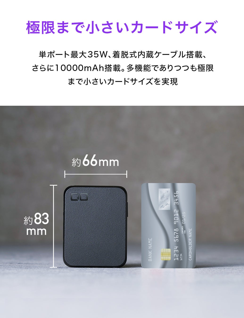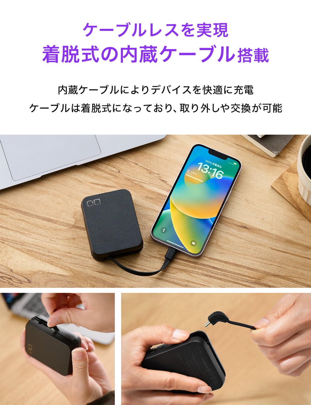 お客様のお声を反映した着脱可能なケーブル一体型、かつ超コンパクトなカードサイズのモバイルバッテリーでライフスタイルをより豊かに。
