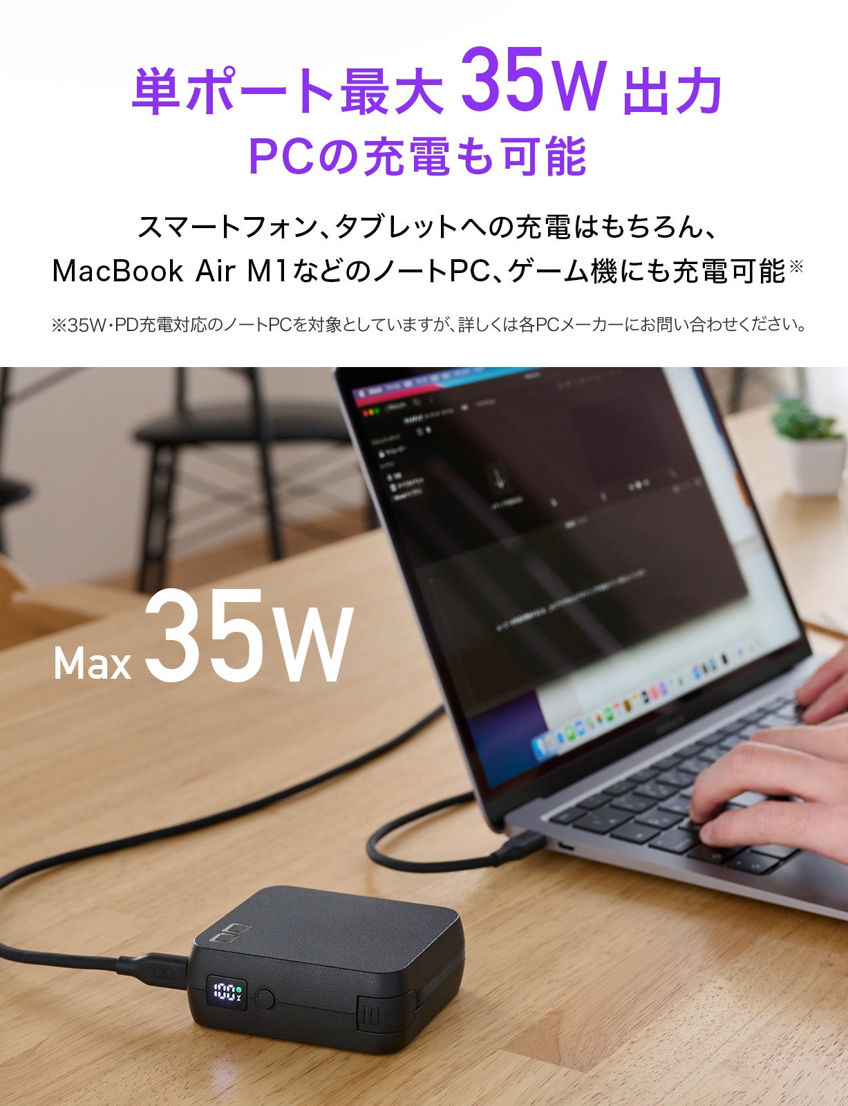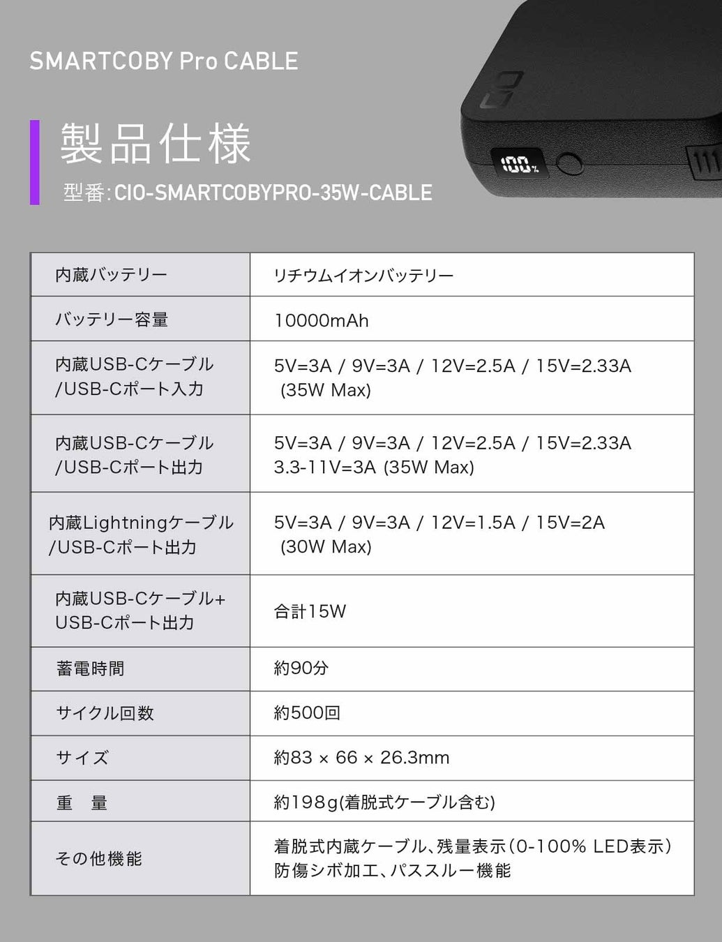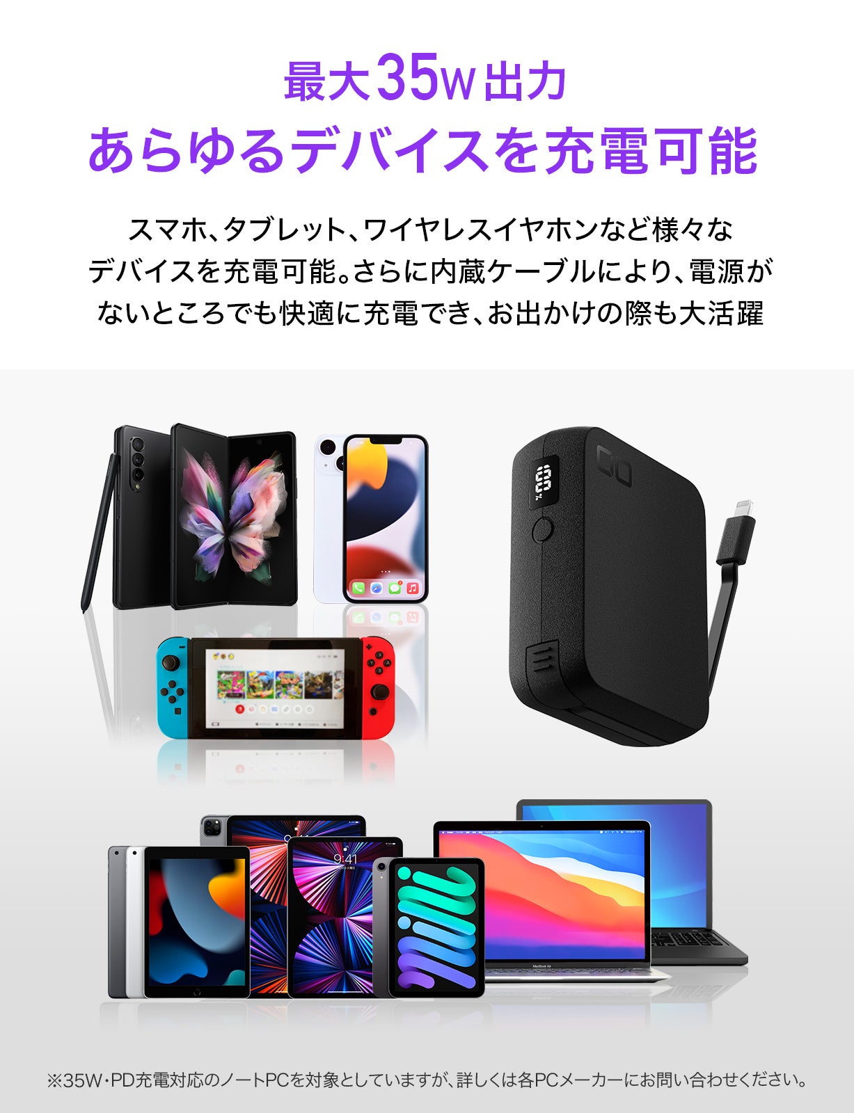 単ポート最大35W出力・着脱可能なケーブル一体型・防傷シボ加工・Cポート×2搭載 USB-CtoLightnigケーブル内蔵 残量はデジタル表示を採用