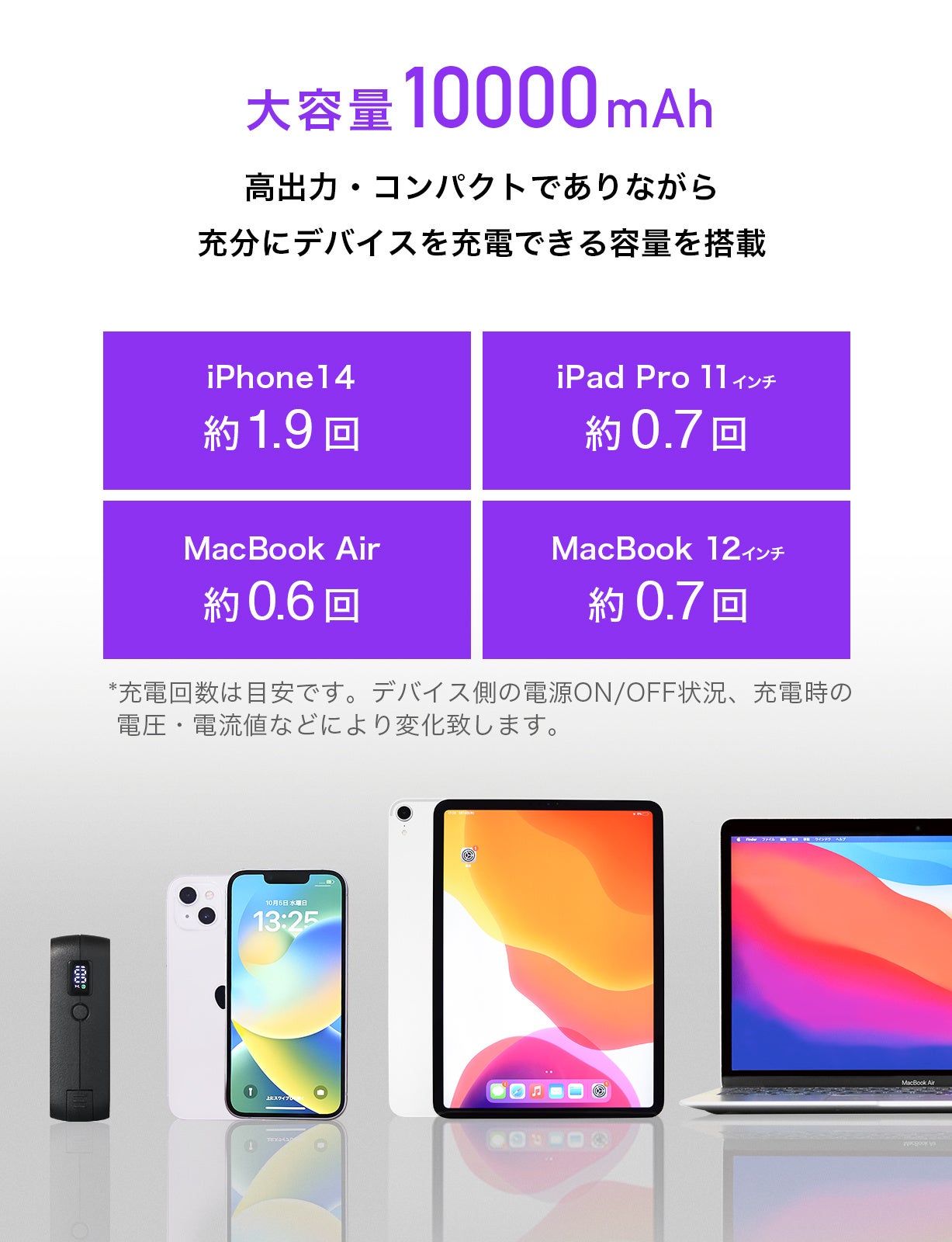 様々なスマホを約1.5回以上、PC・タブレットも約0.5回以上の充電可能です。
