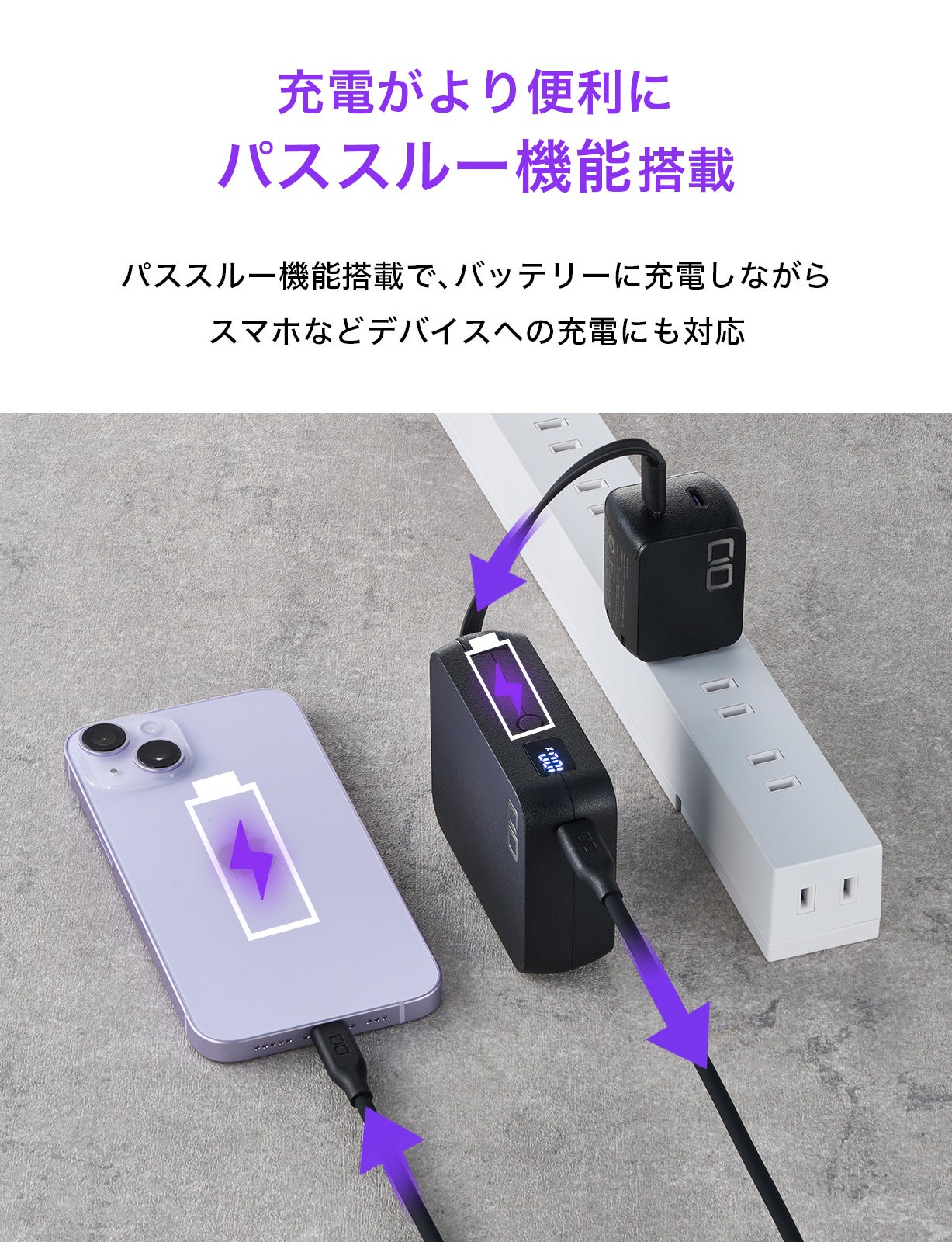 バッテリーを充電するのが面倒で、使いたい時にバッテリーが空になっている事も。『SMARTCOBY Pro CABLE』はパススルー機能搭載で、バッテリーに充電しながらスマホなどへの充電にも対応しております。