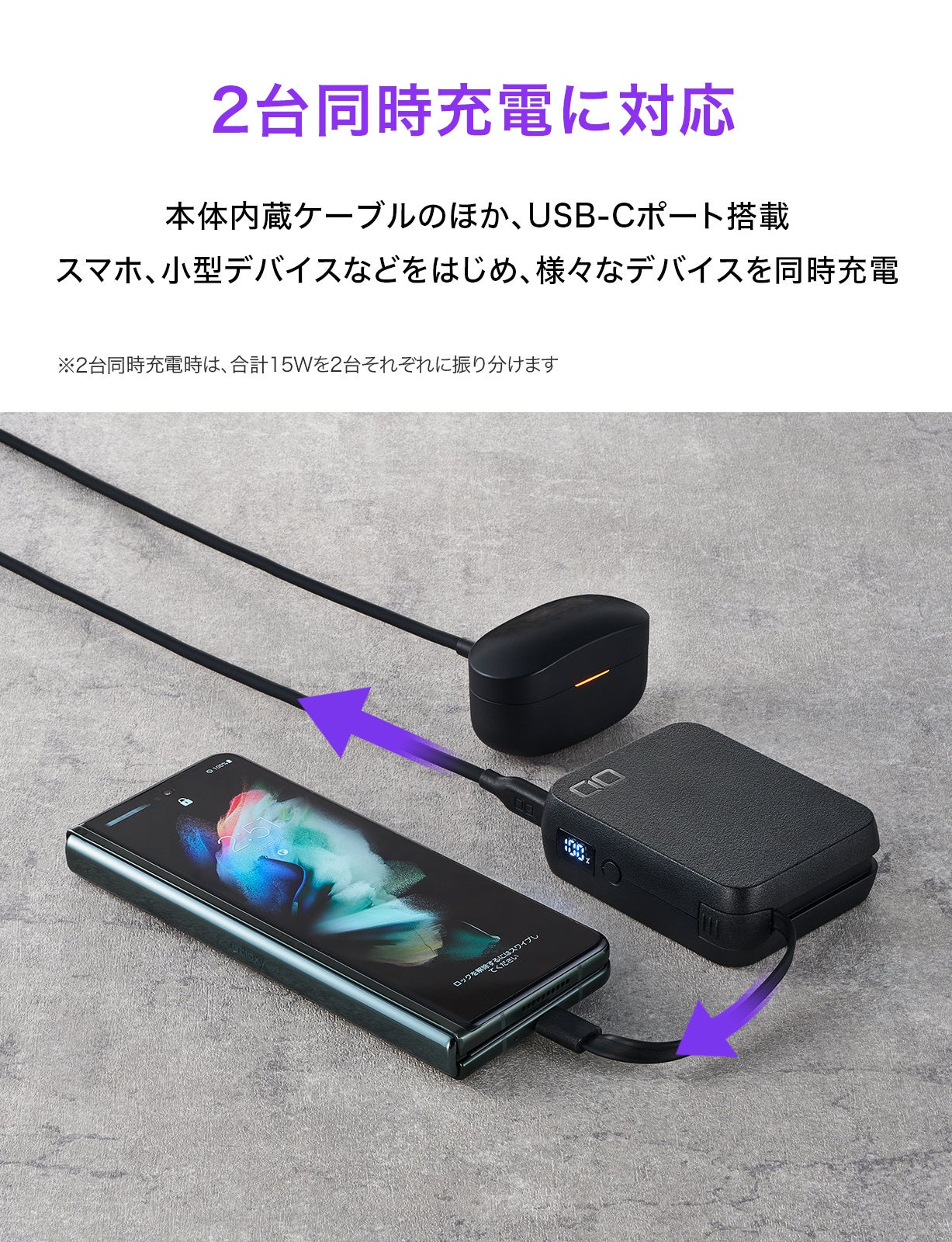 また2台同時充電にも対応しており、複数のデバイスを同時に充電することも可能です。