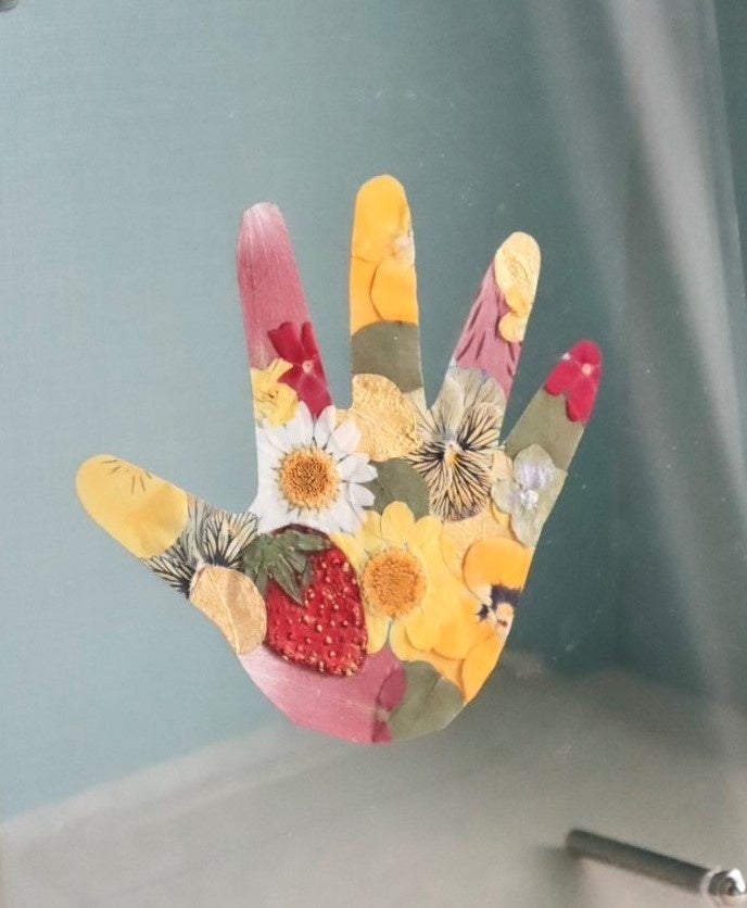 お子さまの手形に合わせて、お好きな押し花を並べて作るアート。お部屋に飾るインテリアとしても。