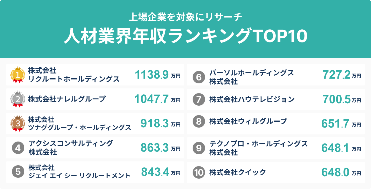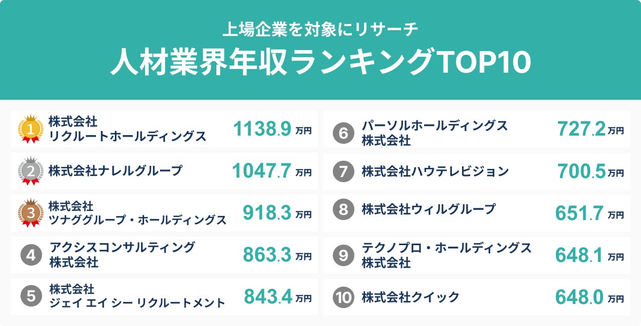 上位2社は年収1,000万円超え!?人材業界平均年収ランキングTOP10を発表!/SalesNow DBレポート