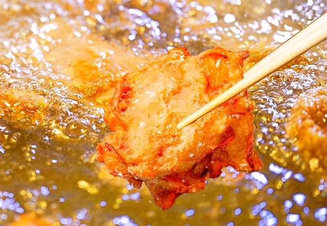 漁で獲れたさまざまな魚をすり身にし、野菜をゴロゴロ入れて手作りのさつま揚げを作りました。その日獲れた魚を使用するので、イワシを使えば見た目は黒っぽく旨みが濃く、白身の魚を使えば見た目はキツネ色で上品な味わいになり、素材によってさまざまな味わいをお楽しみただけます。