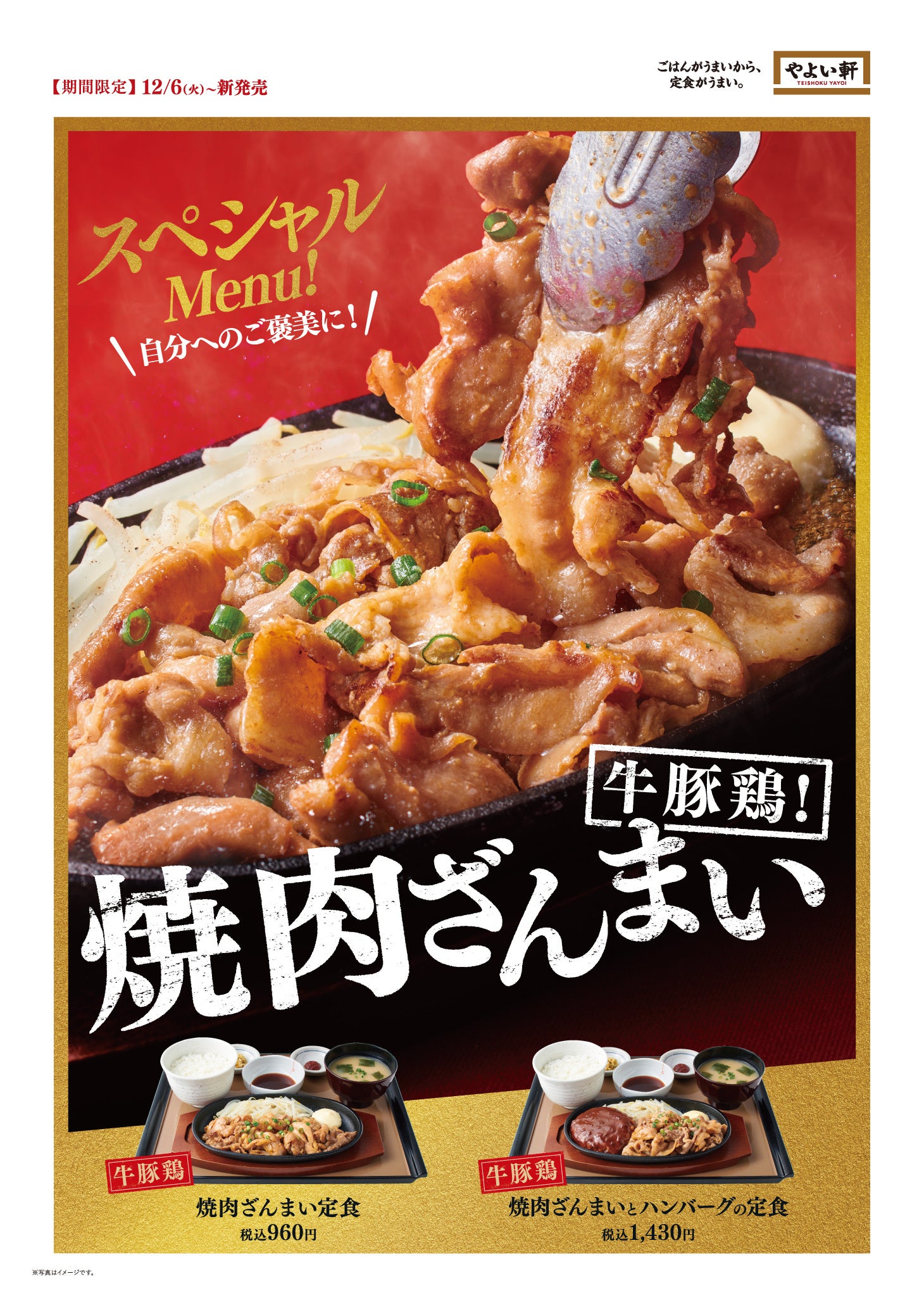 「やよい軒」の“ご褒美定食”誕生 3種の肉を一度に堪能できる、贅沢なよくばり定食『【牛豚鶏】焼肉ざんまい定食』焼肉×ハンバーグのスペシャルな肉コラボ!『【牛豚鶏】焼肉ざんまいとハンバーグの定食』
